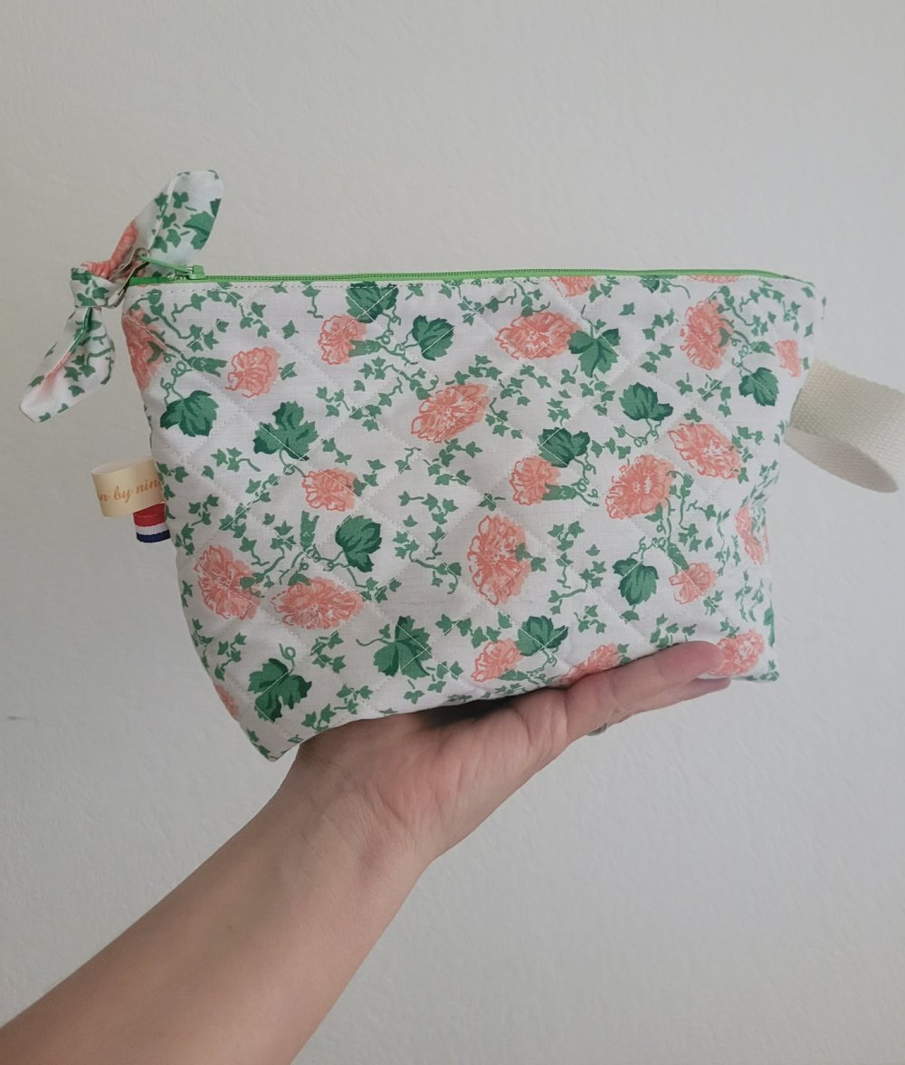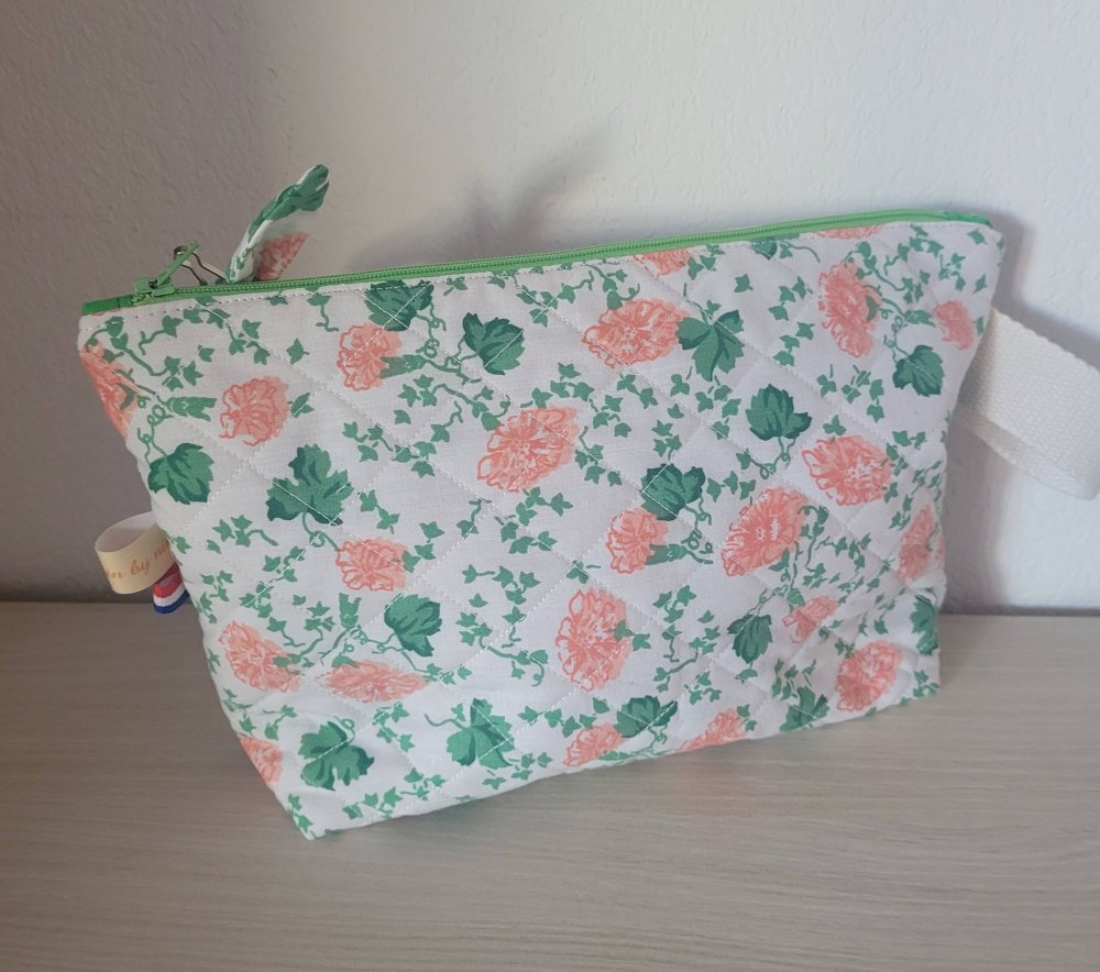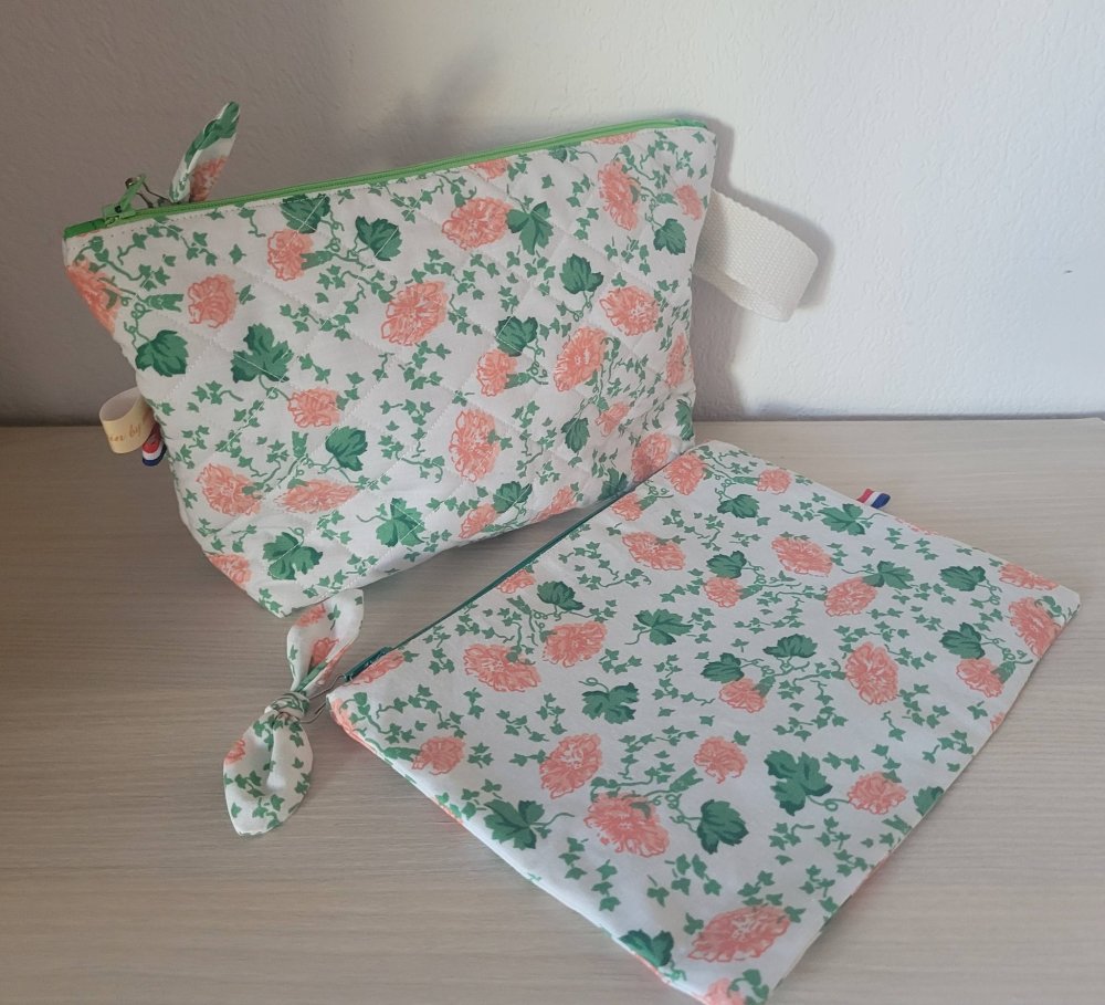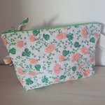 Trousse maquillage ou de toilette en tissu de coton fleuri .Doublée de coton vert.