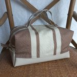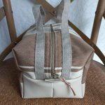 vanity pour maquillage,lunch bag,toilette,toile rayée beige-écrue,simili cuir beige,sangle en lin couleur naturelle,doublé,poche plaquée