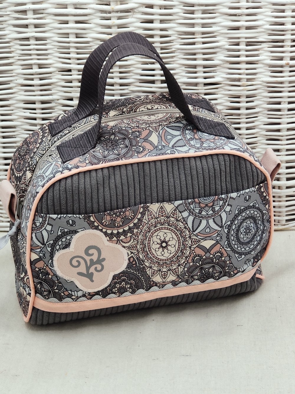 L'intérieur est doublé et molletonné, avec une poche zippée, il se porte par deux anses