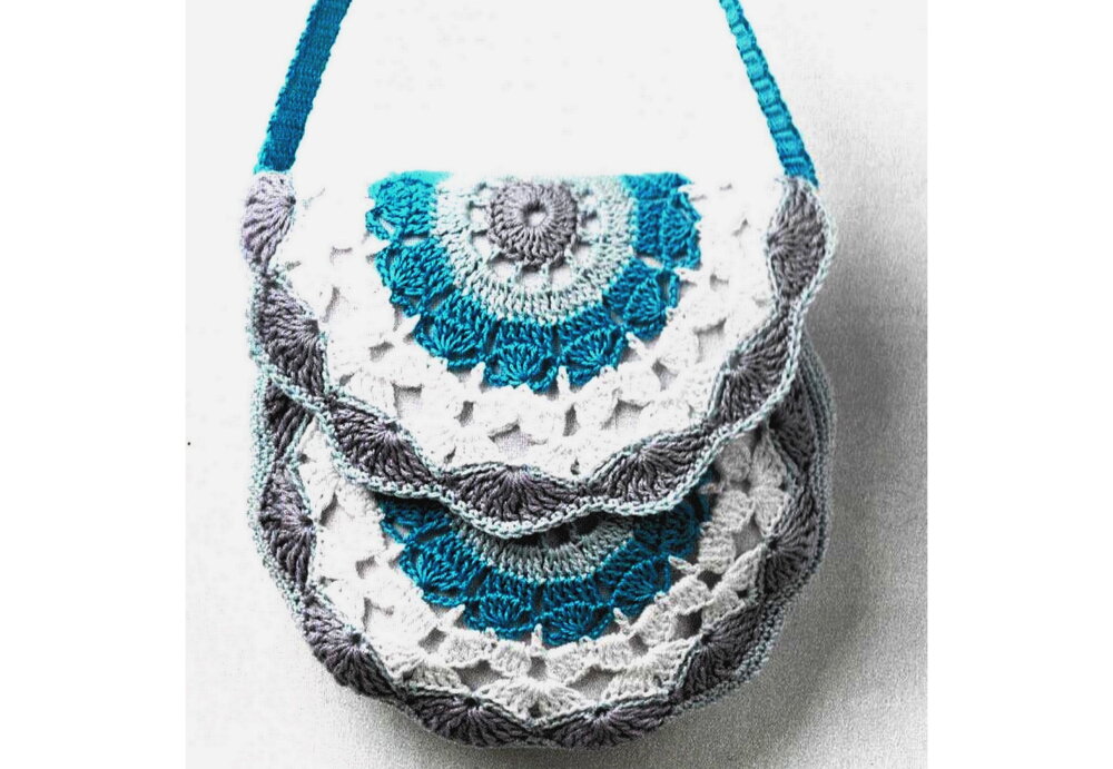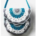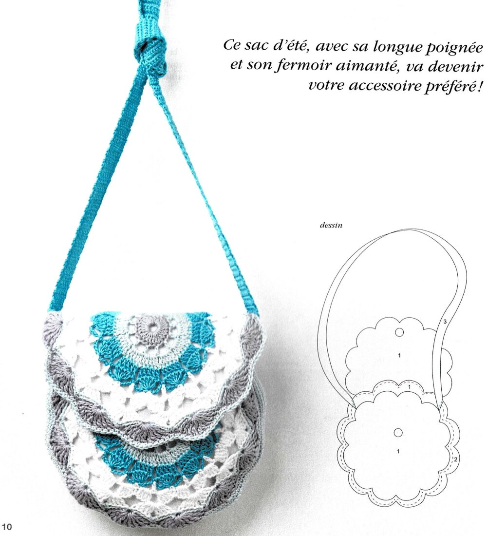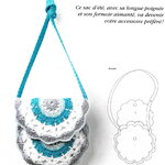 Modèle de POCHETTE en coton turquoise , blanc et bleu azur , au crochet n° 2,5 , fermé par un fermoir aimanté , à crocheter rapidement en 6 h !