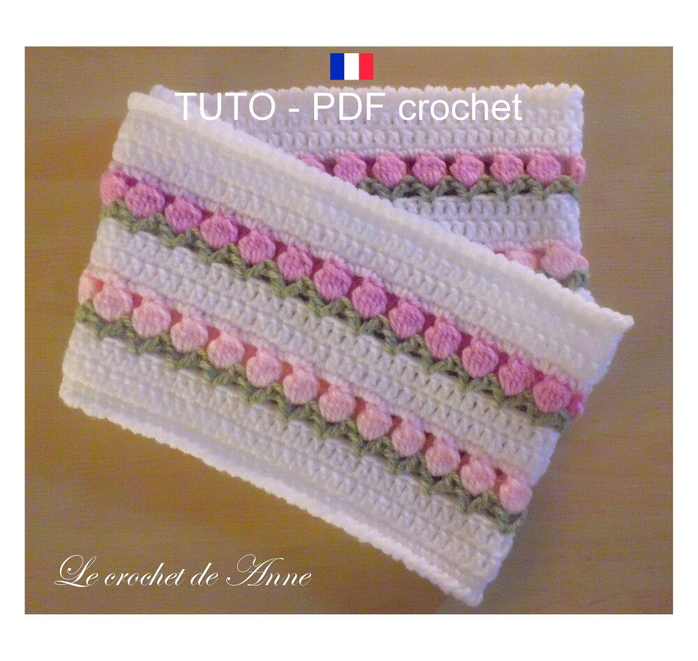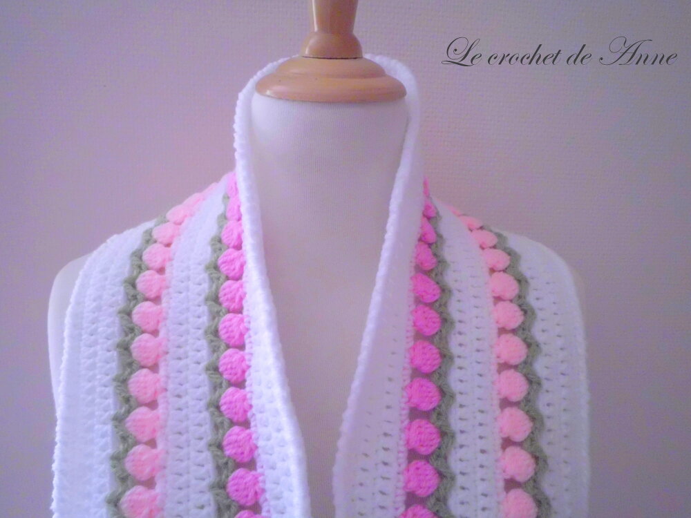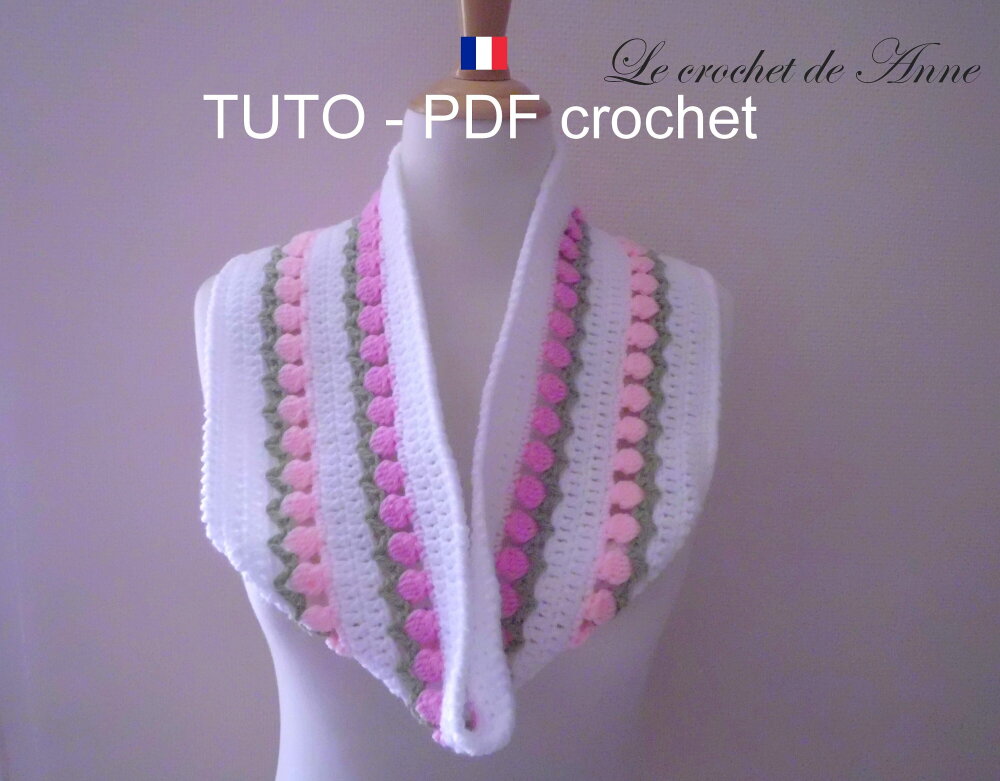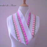 Très facile à réaliser ce superbe SNOOD / TOUR DE COU circulaire , orné de jolis fleurs roses , mauves et vertes pour les feuilles , sur fond blanc , grâce à mes explications très claires !