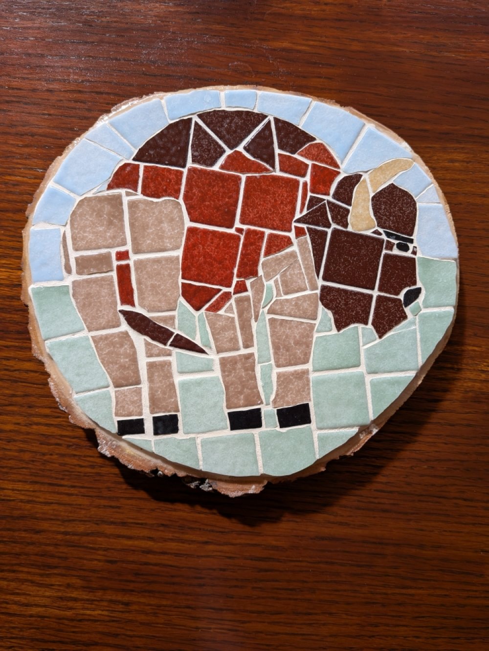 Ce dessous de plat est un rondin de bois sur lequel j'ai collé de la mosaique résistante au chaud pour recevoir vos casseroles et vos plats chauds.
