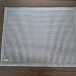 Je suis de couleur "Ecru", mesure 42 cm x 52 cm environ, je possède une petite étiquette de mon atelier de fabrication pour me suspendre à un support.