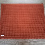 Je suis de couleur "Terracotta", mesure 42 cm x 52 cm environ, je possède une petite étiquette de mon atelier de fabrication pour me suspendre à un support.