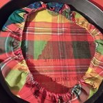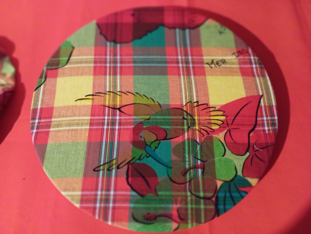 en coton madras rouge/vert/jaune + Elastique. Une charlotte motif carte, une charlotte motif perroquet