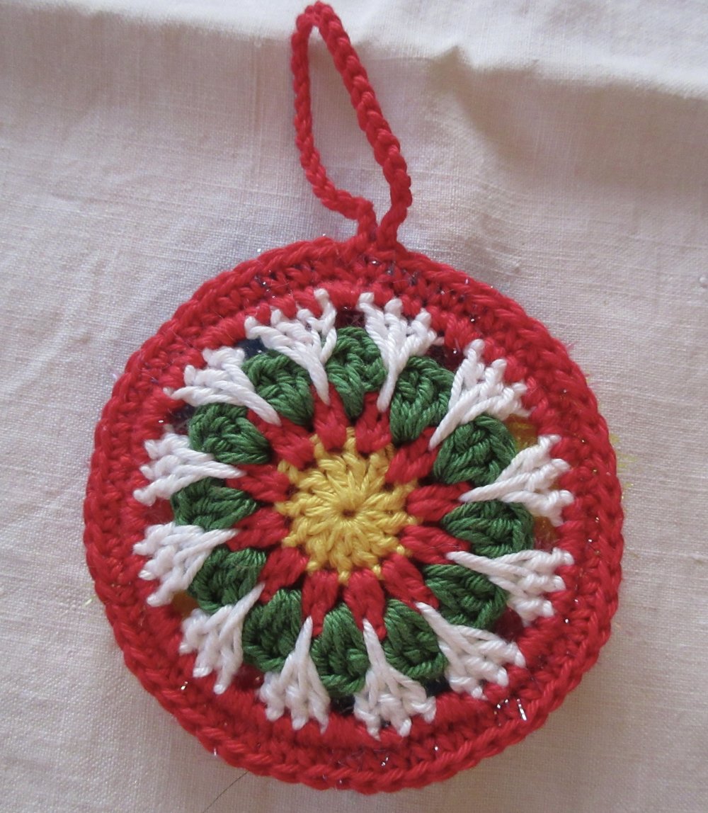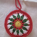 Réalisée au crochet en coton avec un joli motif, en jaune, rouge vert et blanc,