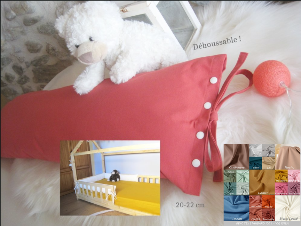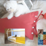 Voici pour votre enfant de jolis traversins afin d'habiller et de sécuriser son lit ! Bien dormir est important pour votre enfant... Deux versions de confection : des traversins coussins plats ou des traversins cylindriques (boudin) réalisés avec des tissus proposés ; et aussi en sur mesure et à vos couleurs, (avec votre propre tissu). Avec cette version, il est INDISPENSABLE que vous me contactiez pour me demander le métrage de tissu nécessaire que vous achèterez vous même pour la fabrication de vos articles. Faites en la demande par message ou téléphonez au : 06 09 97 83 90.