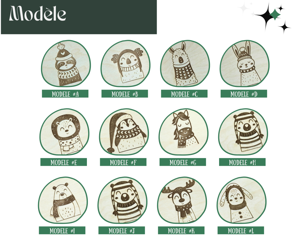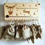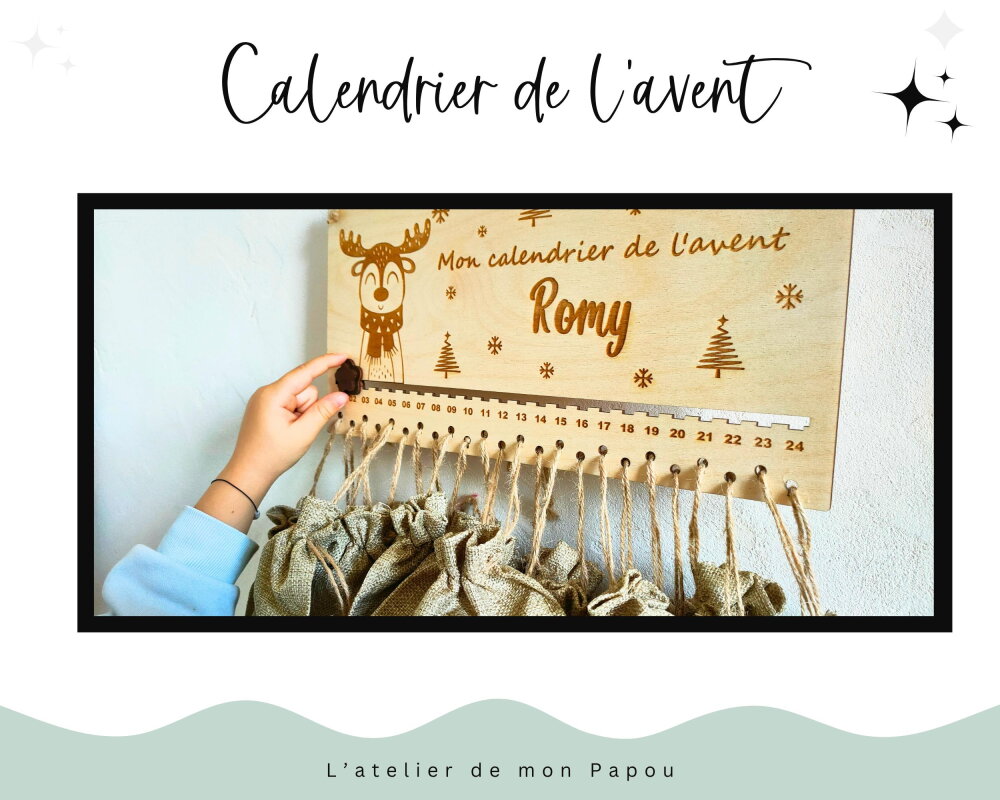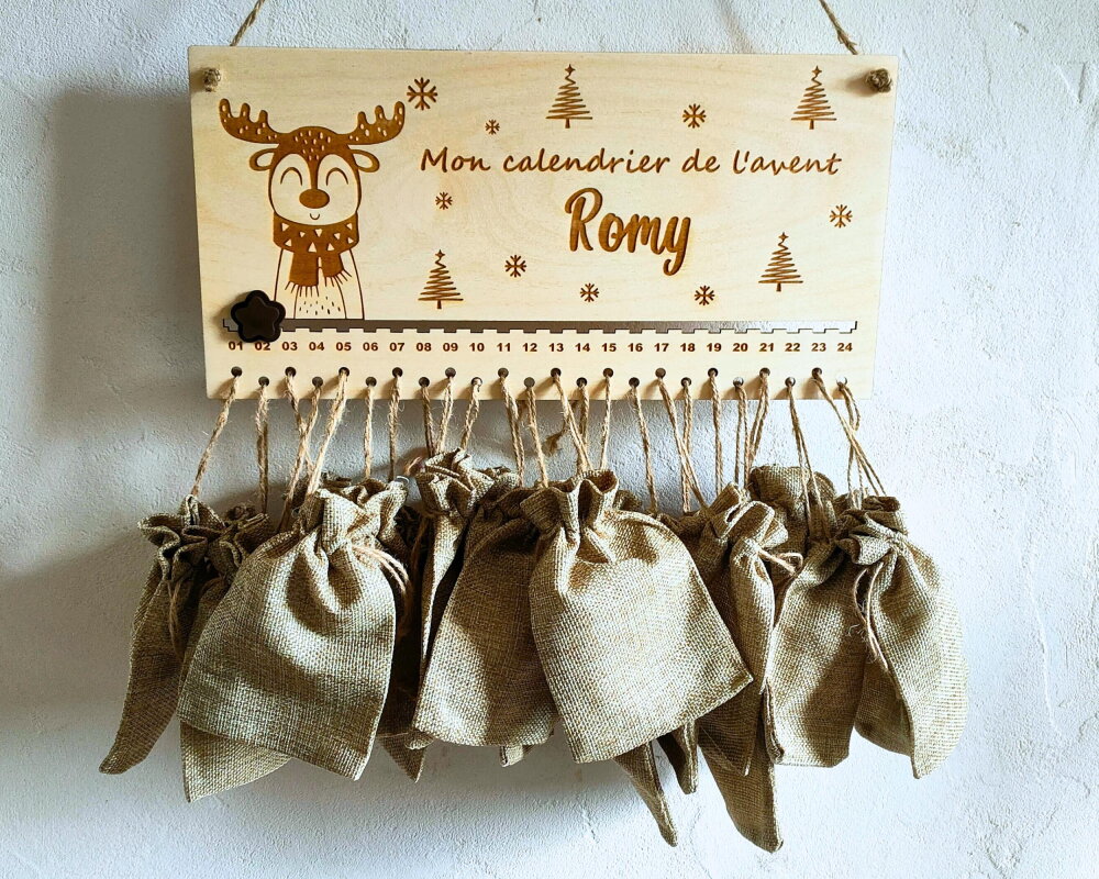 Pour une expérience clé en main, cette version comprend la plaque murale en bois gravée avec le motif animalier et le prénom + 24 petits sacs en toile de jute à garnir selon vos envies (chocolats, jouets ou messages 🎅)