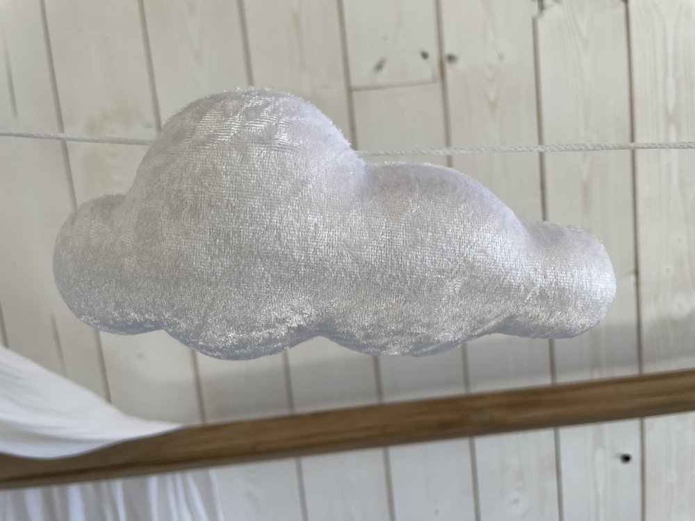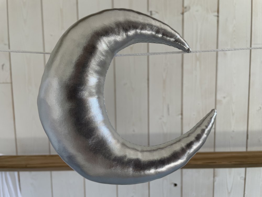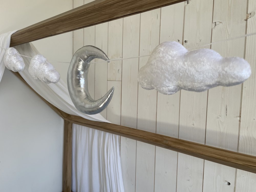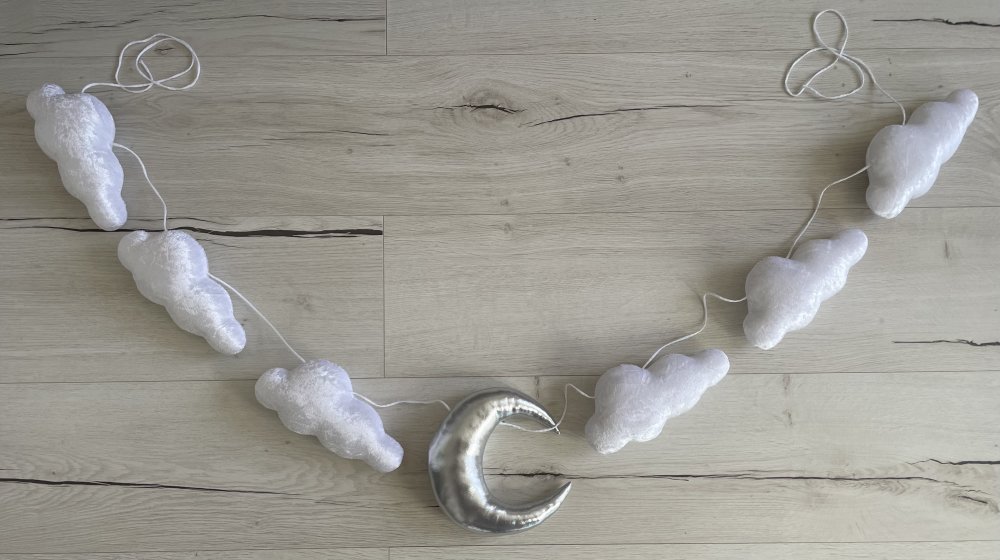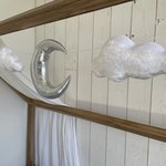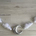 Guirlande de 1 lune argent métallisé, 6 nuages blanc en velours.