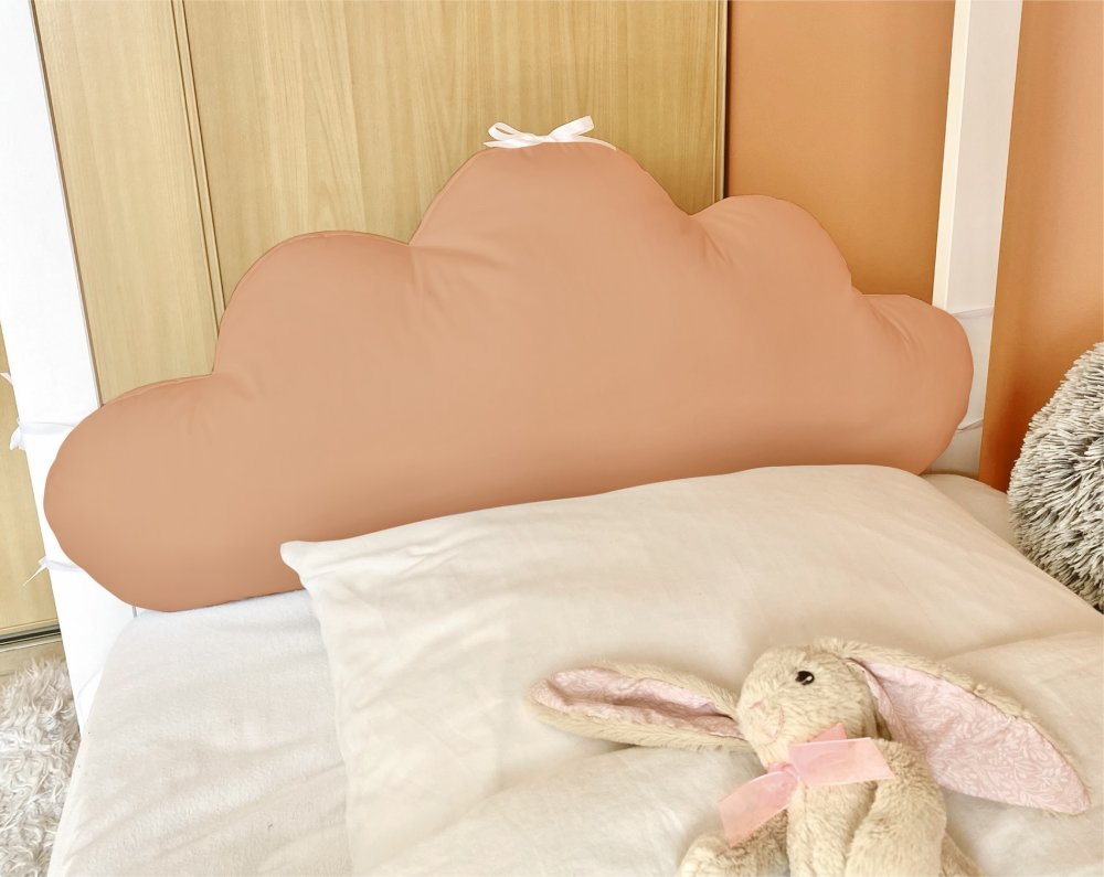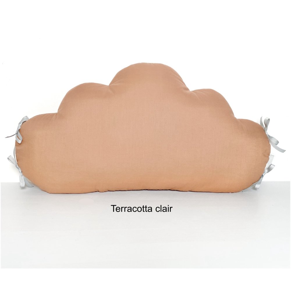 Coussin nuage couleur terracotta uni pour un usage multiple, tête de lit, coin détente lecture etc... Liens d'attache sur les côtés du nuage (droite et gauche). Pour l'ajout d'un lien supplémentaire en haut et en bas du coussin, merci de le préciser en message joint à votre commande.