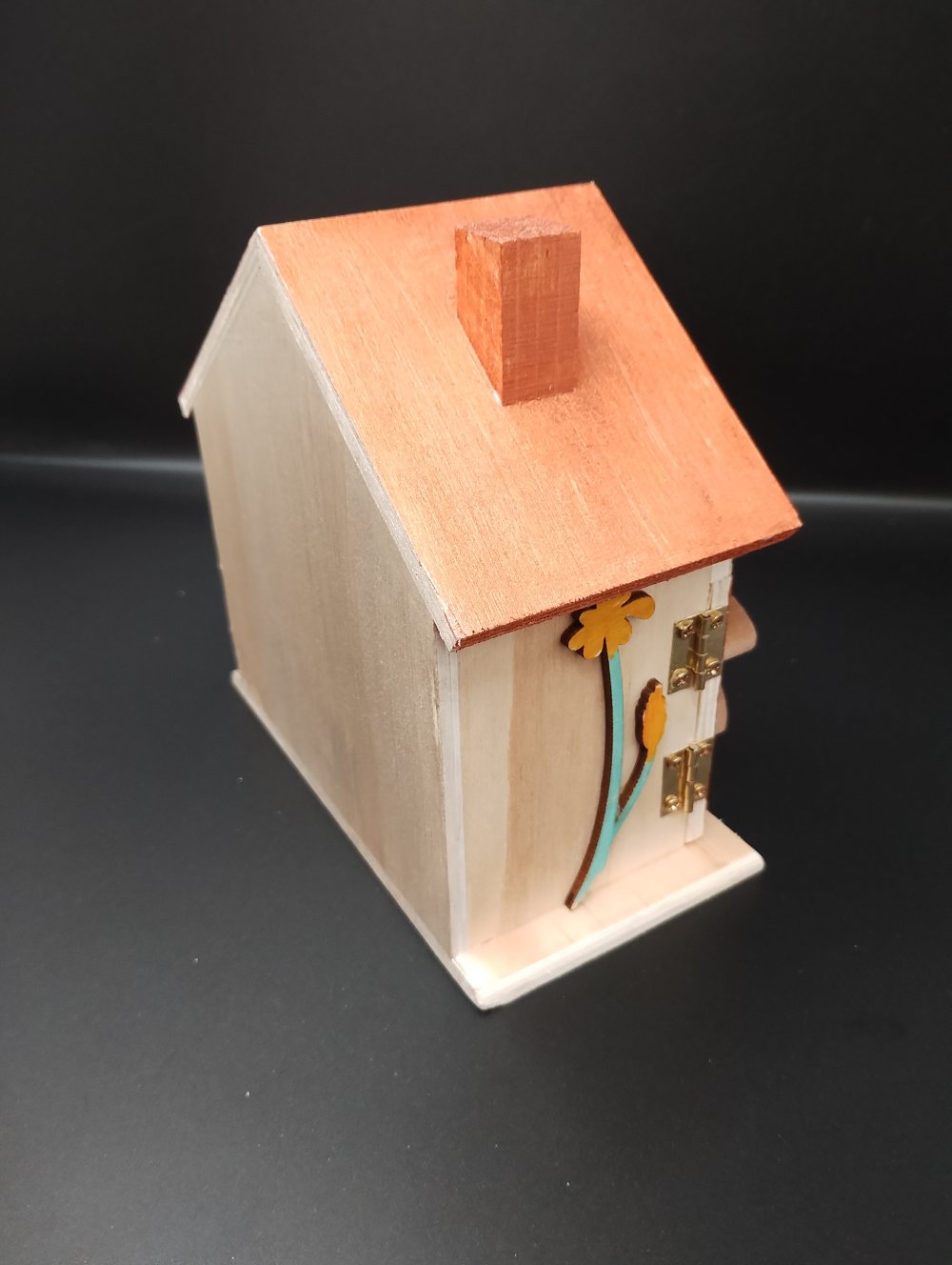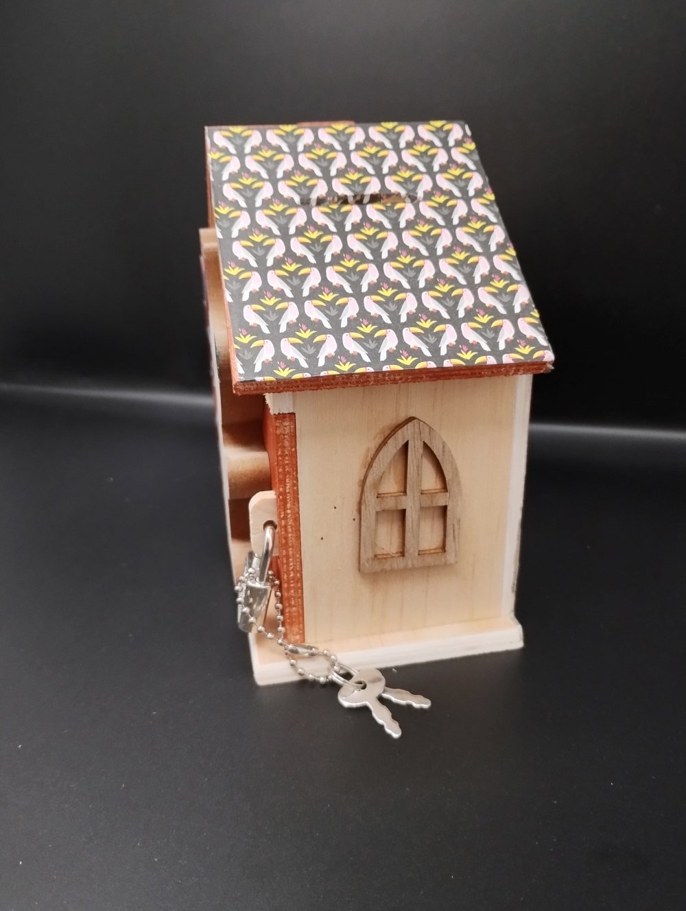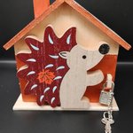 Tirelire en bois naturel en forme de maison avec cadenas et clés. hérisson en bois