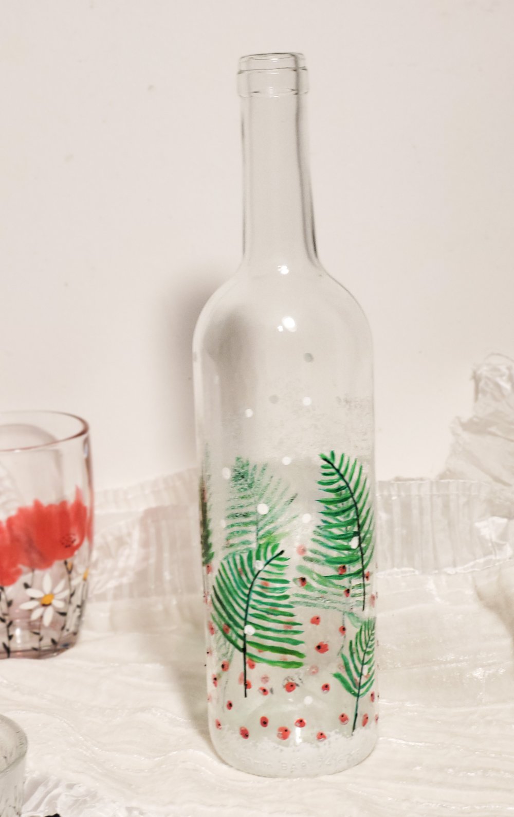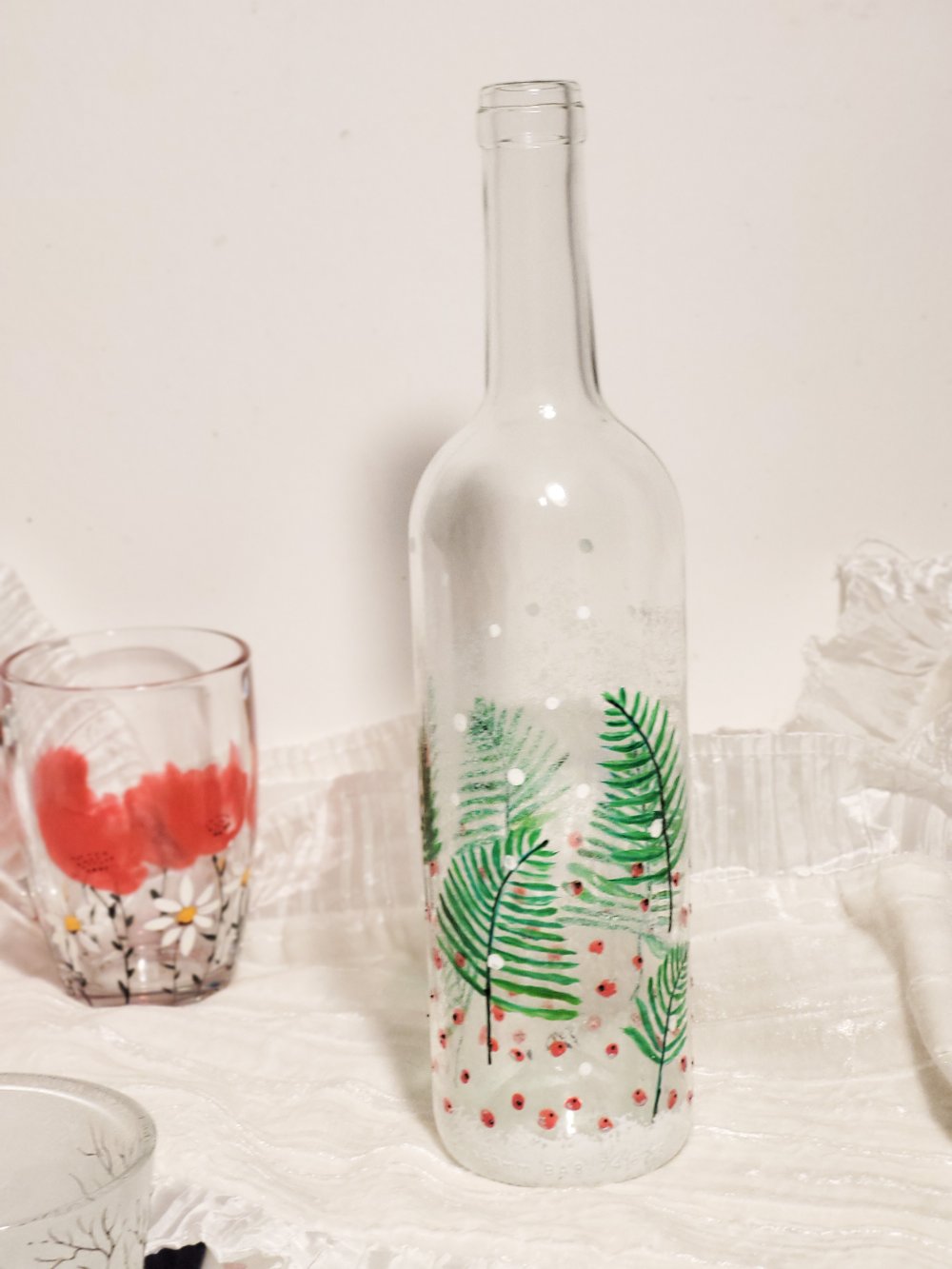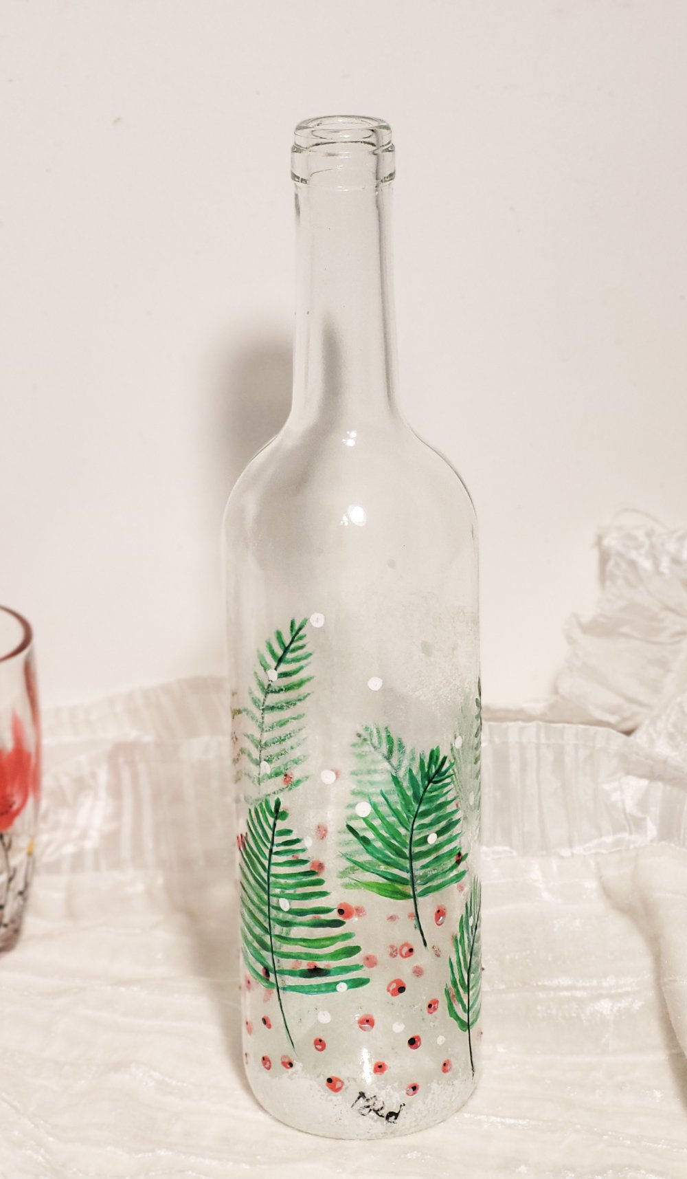Bouteille en verre peinte d’un motif de Noël à la peinture spéciale verre