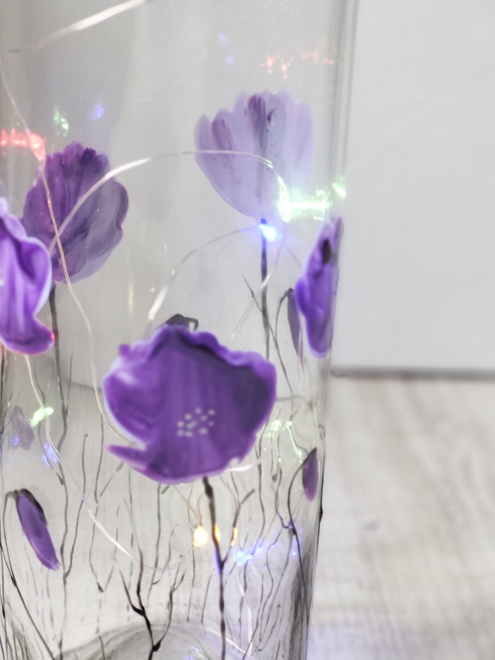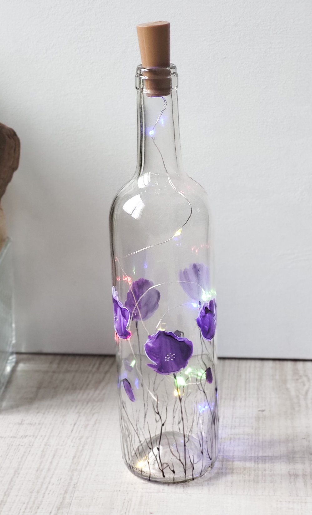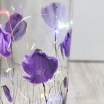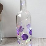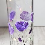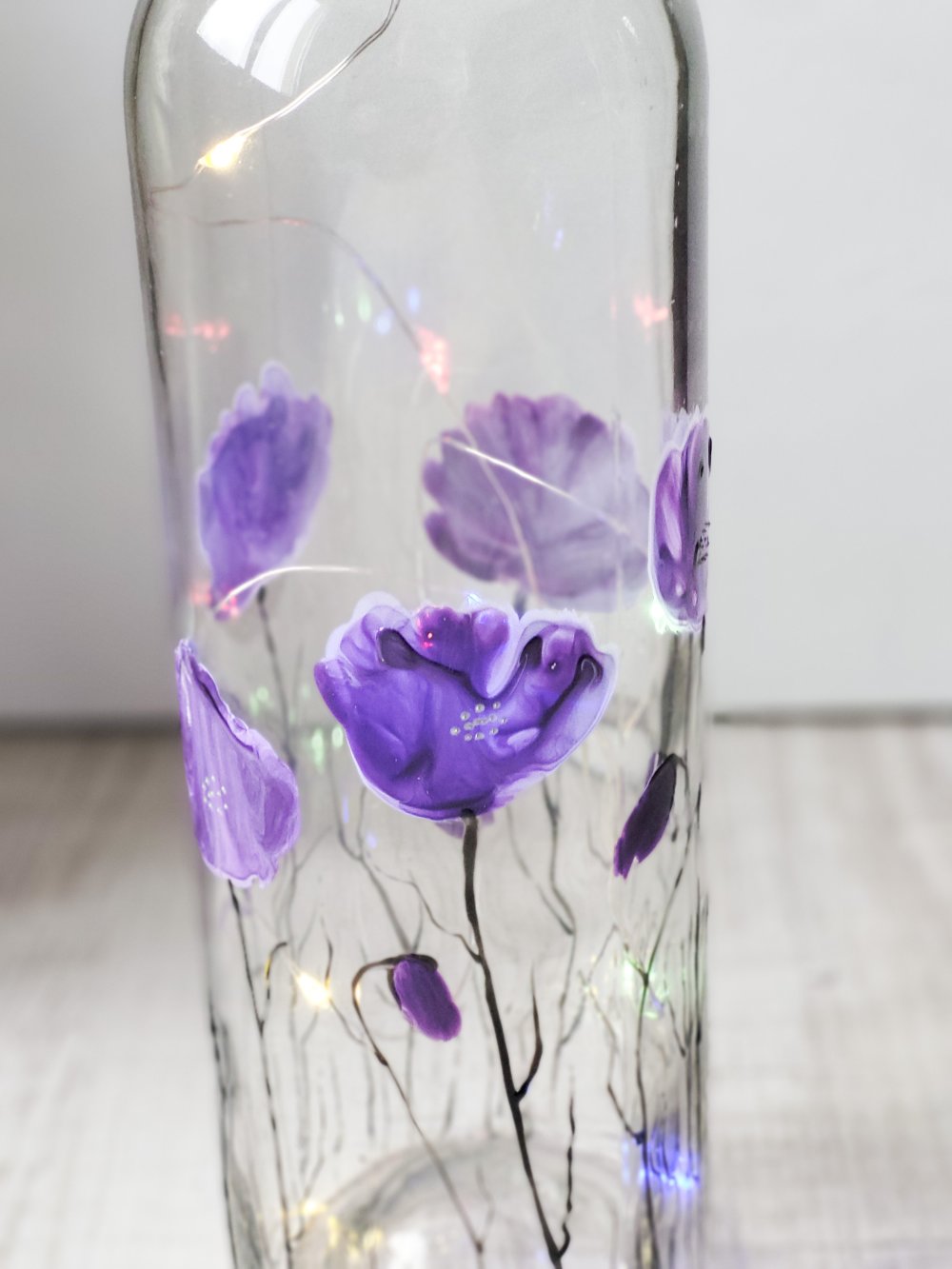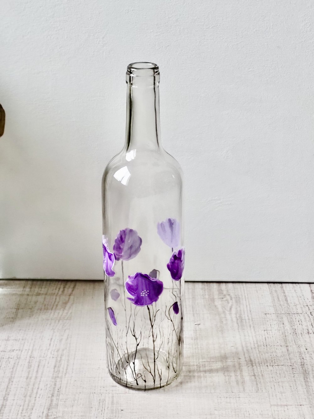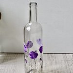 Bouteille en verre peinte d’un décor de coquelicots mauve à la peinture spéciale verre.
