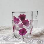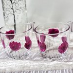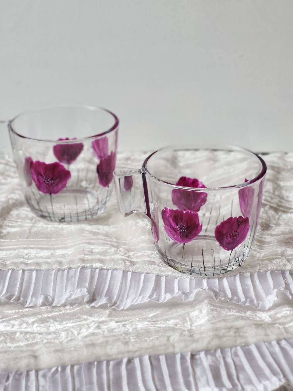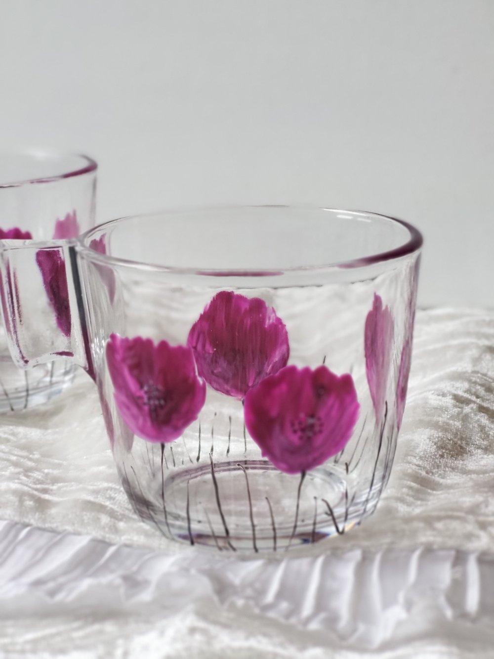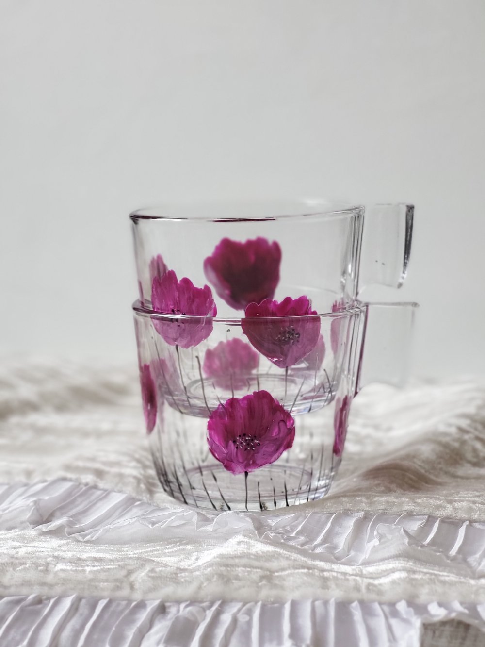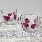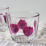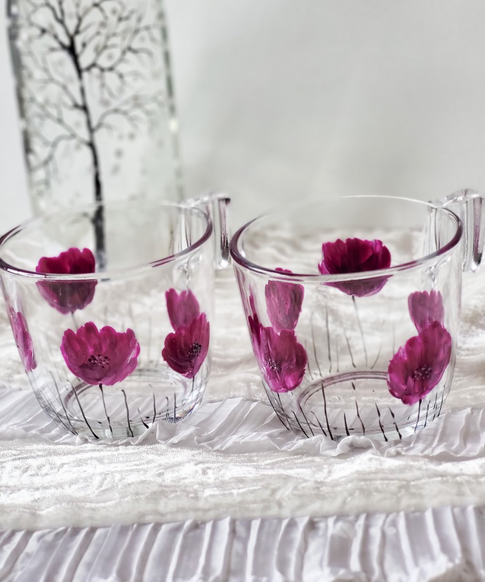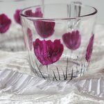 Tasses en verre de marque Ikéa peintes d’un motif de coquelicots violine
