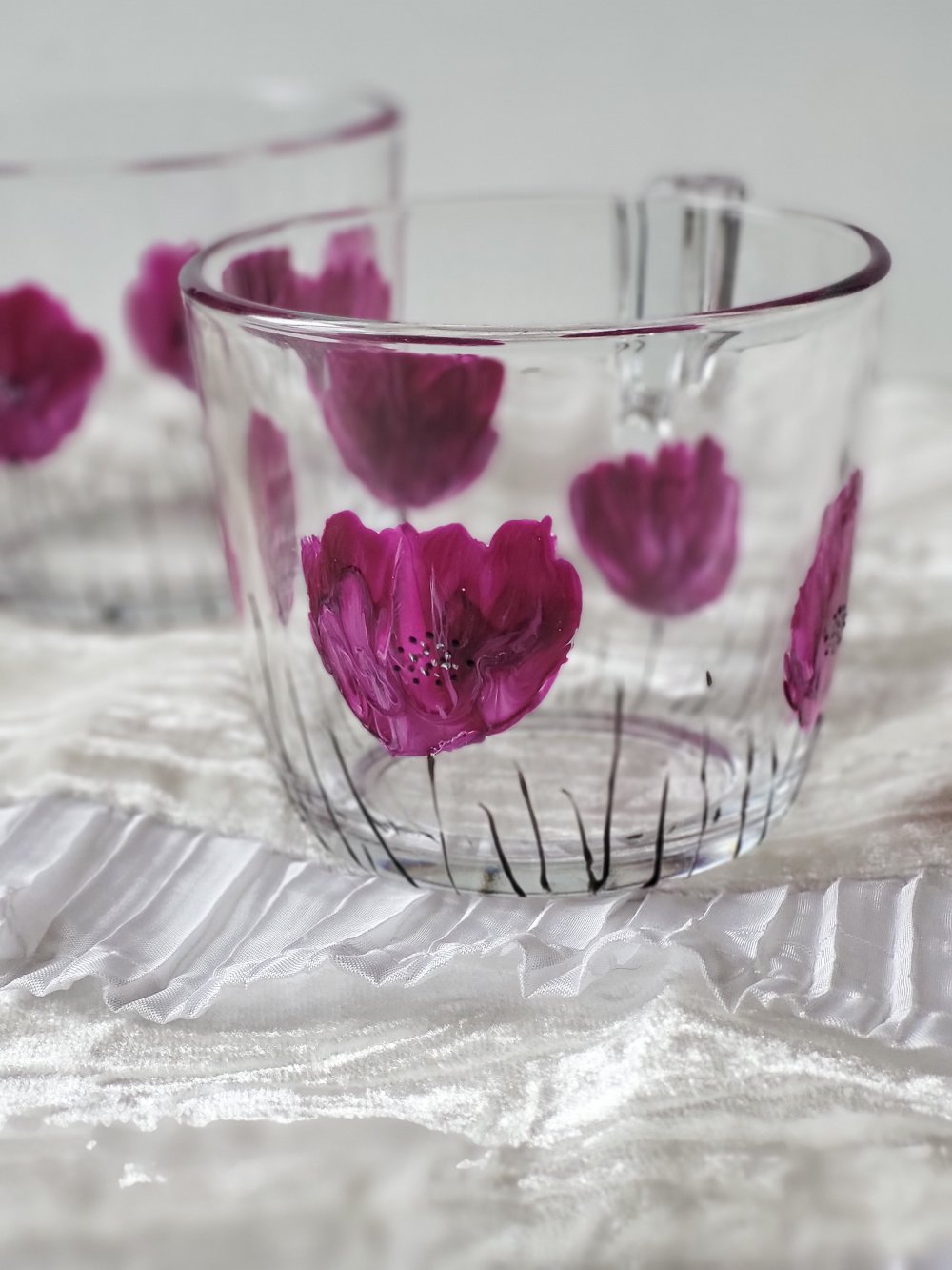 Tasses en verre IKEA peintes en verre d’un motif de coquelicots violine et noir. La peinture est fixée au four.