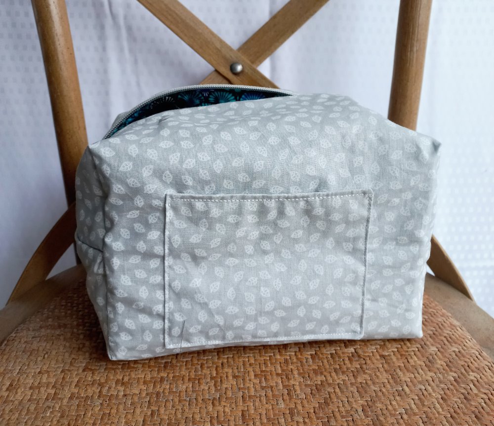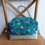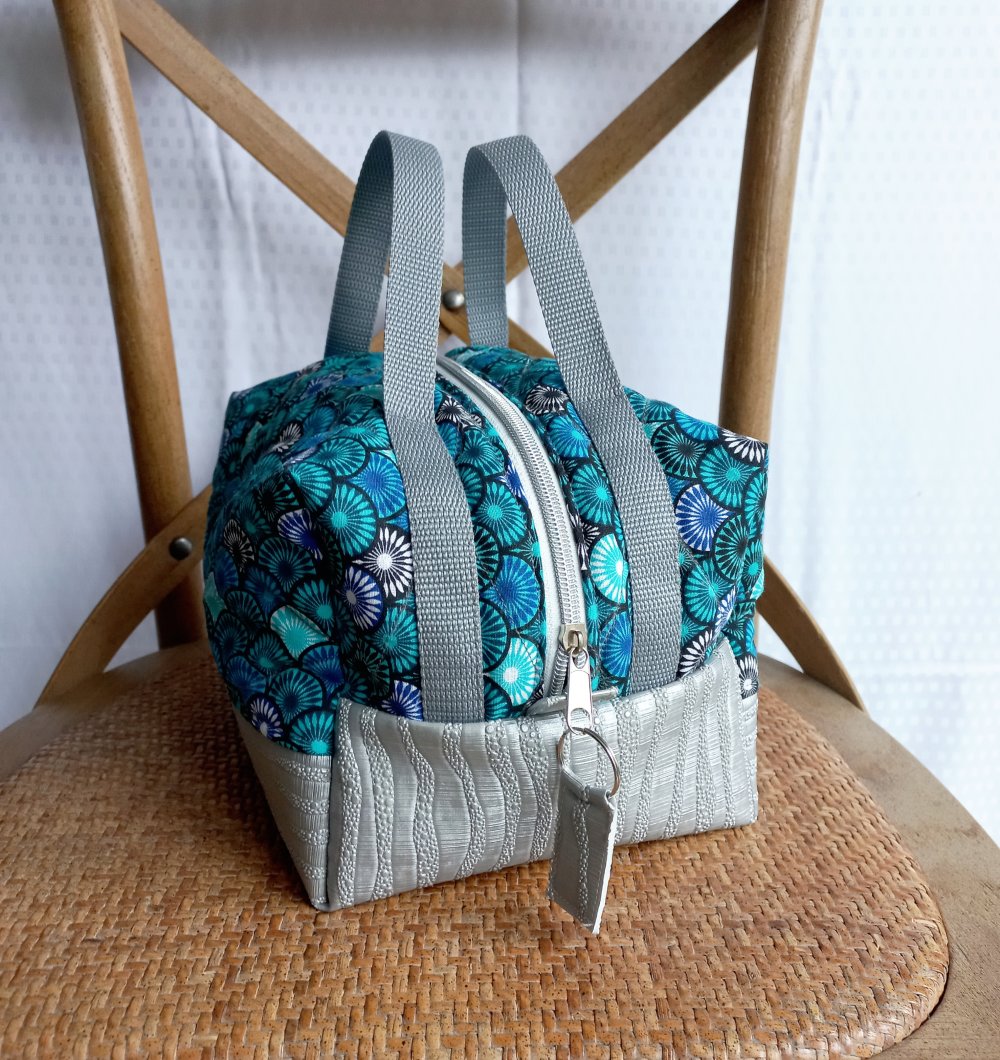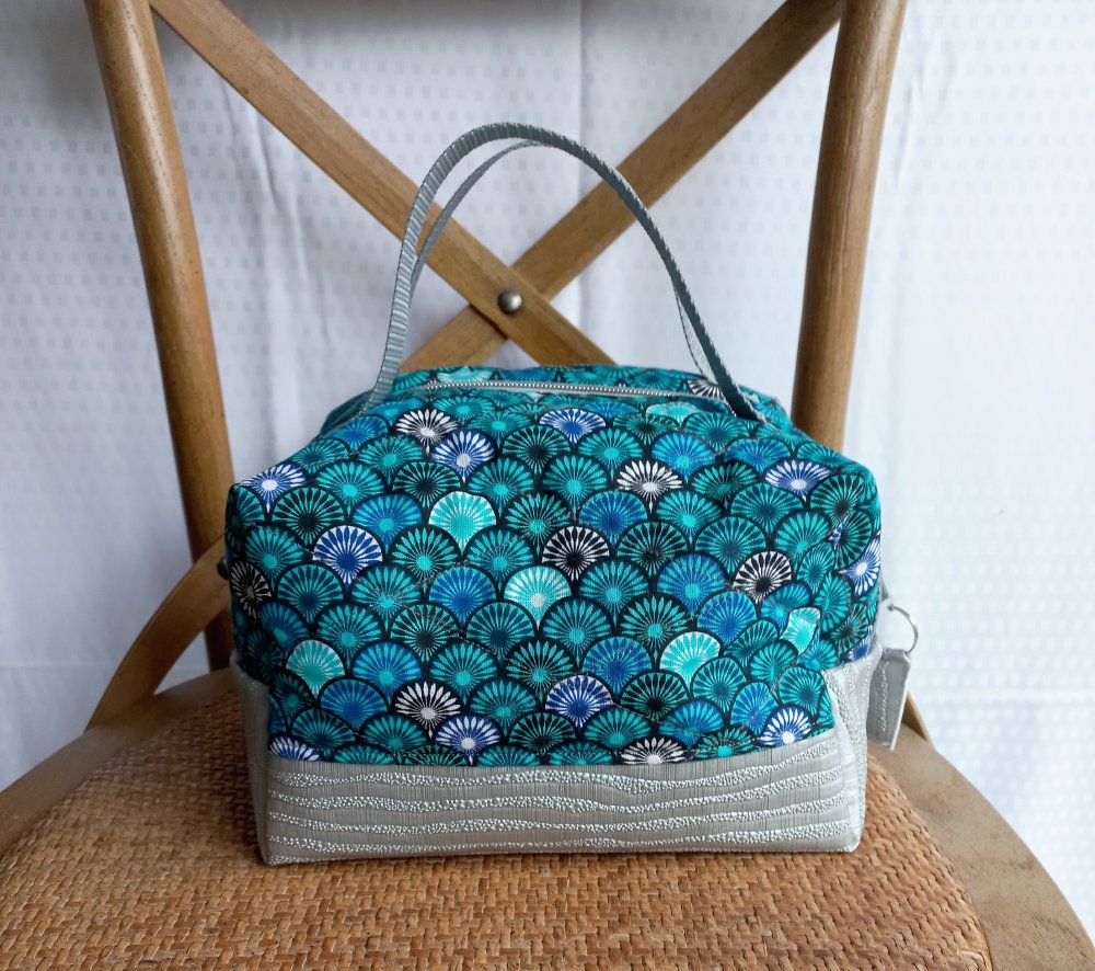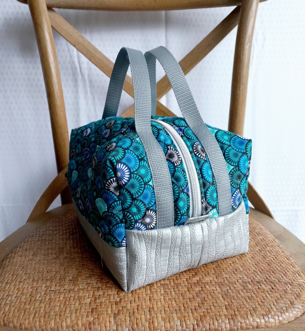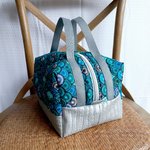 Nouvelle collection: Vanity ou lunch bag ou vanity de toilette, tissu aux motifs éventails bleu,matelassé avec une base de simili cuir argenté..