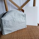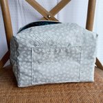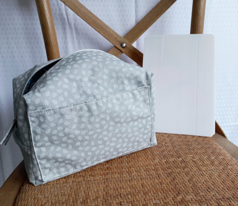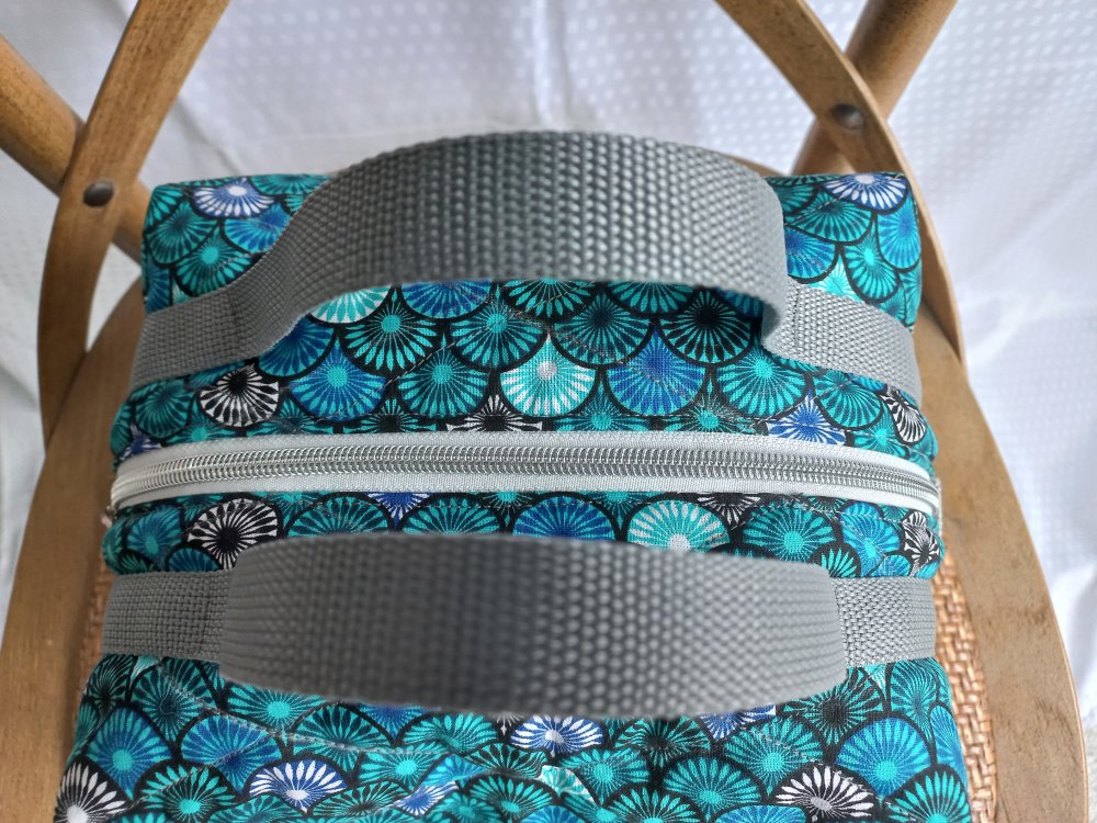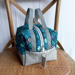 Vanity pour maquillage,lunch bag,toilette,tissu motifs éventails bleus,simili gris argenté,anse grise,doublé,poche plaquée à l'intérieur