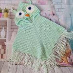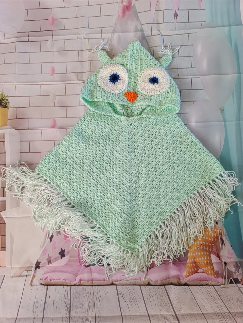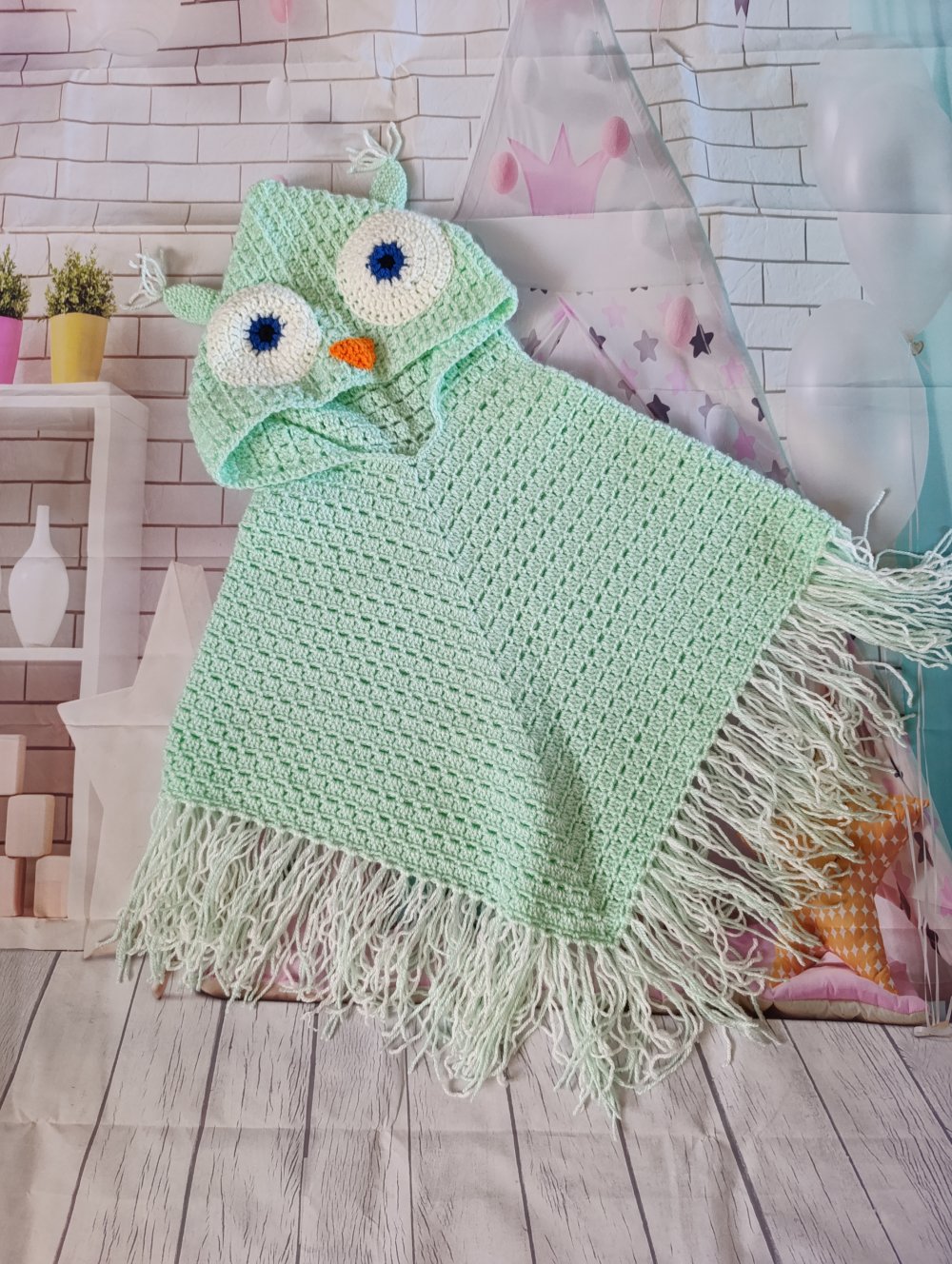 Adorable poncho pour enfant, fait main, avec une capuche en forme de chouette. Doux, confortable et ludique, il deviendra vite la pièce préférée de votre enfant.