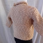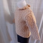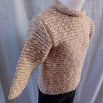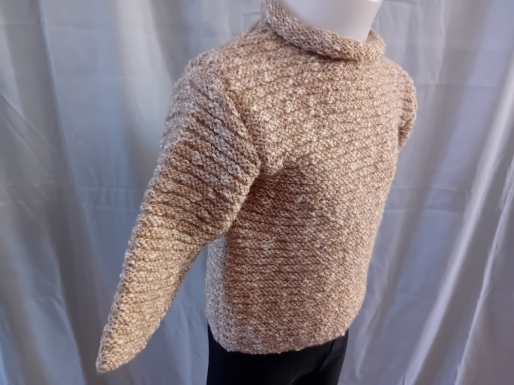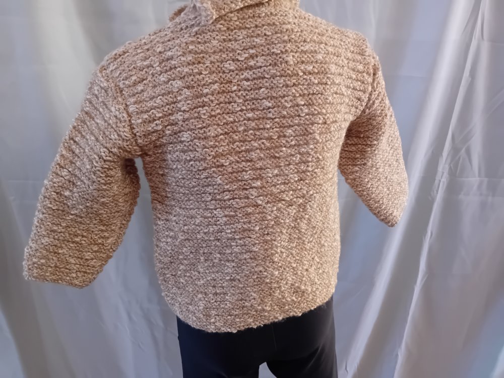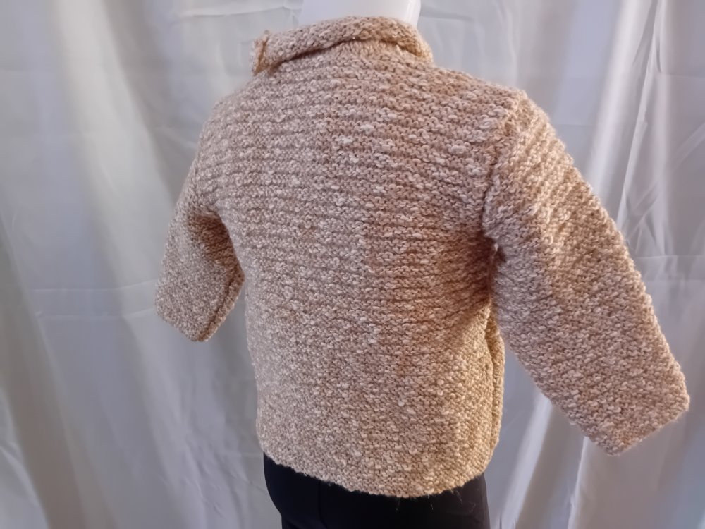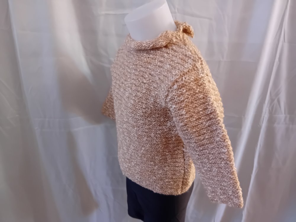 Pull au tricot pour fille, taille 2 ans, couleur beige. Il est tricoté en point de godron, bordures au point mousse, col en jersey.