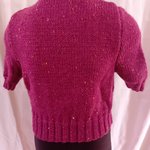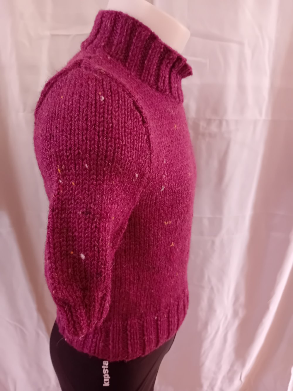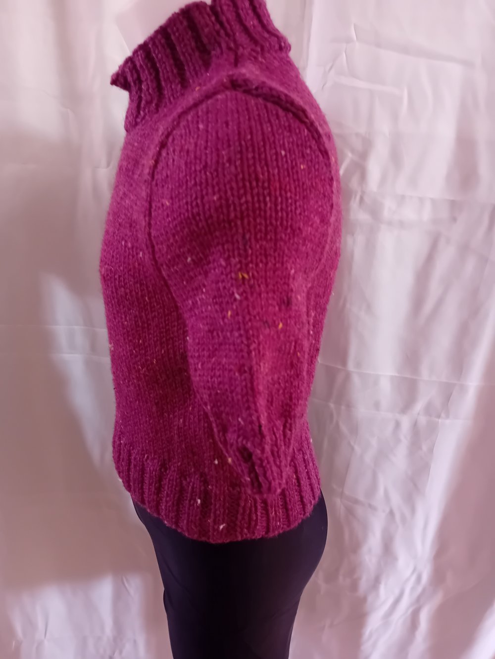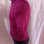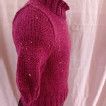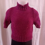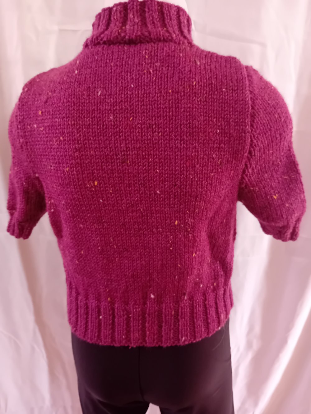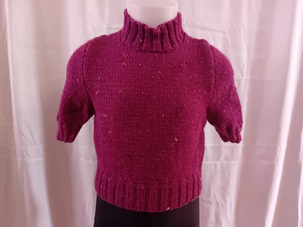 Petit pull pour fille, taille 6 ans, court, manches courtes, tricoté en jersey en qualité Tweed 4 de Pingouin (86% acrylique, 10% laine, 4% viscose, lavage en machine). La couleur est prunelle.