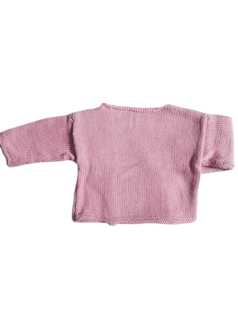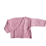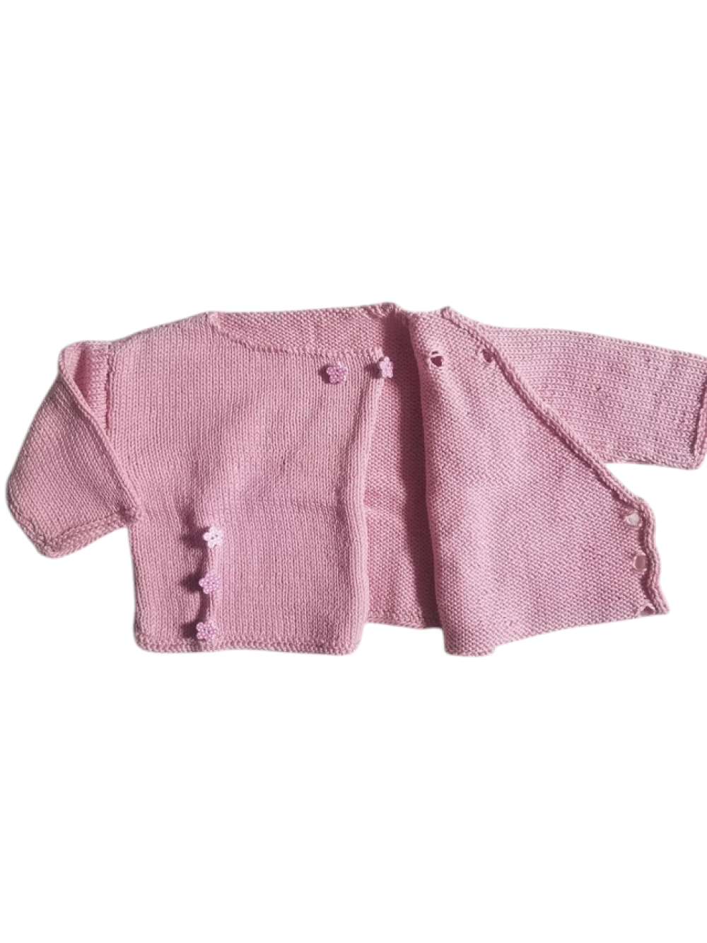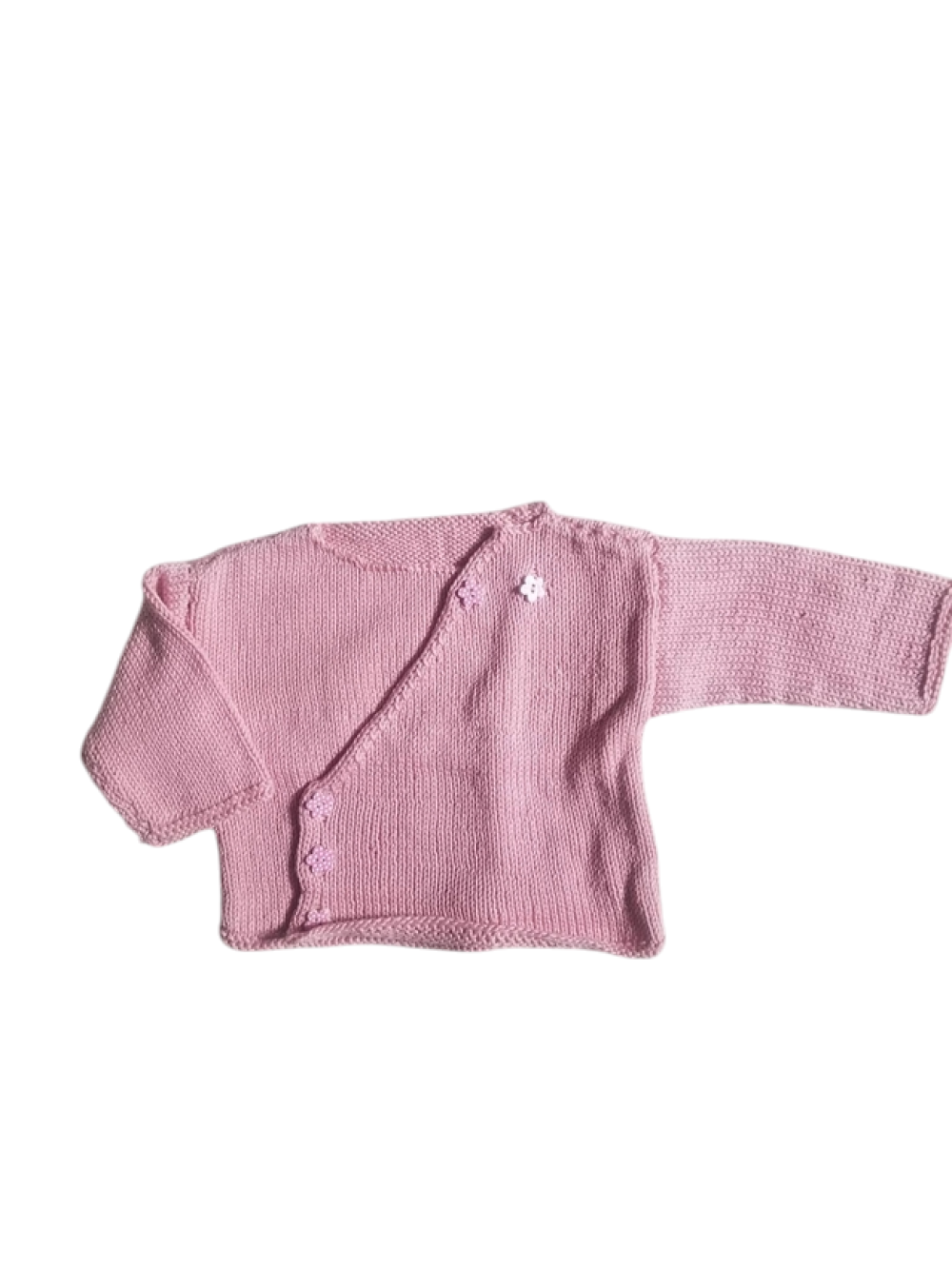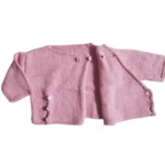 Ce cache coeur est un indispensable dans le trousseau de bébé. Il a été tricoté avec une laine en coton et se ferme par 5 boutons en bois.