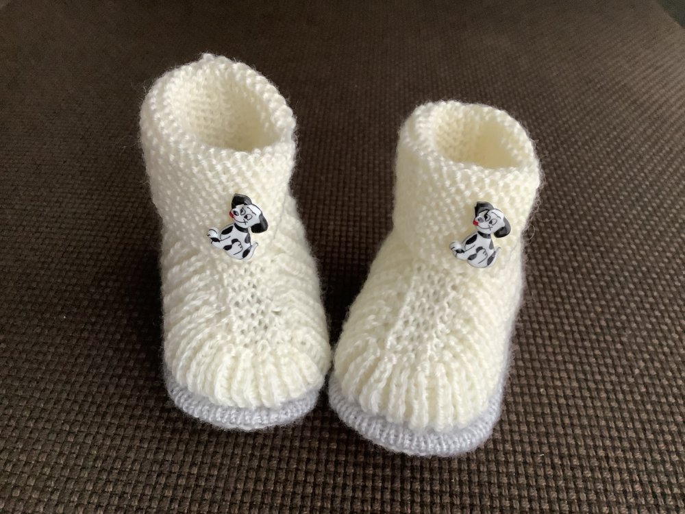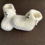 Tricoter main avec soin,ces chaussons pour bébé fille ou garçon de couleur écru élaboré bordure de la semelle gris clair.