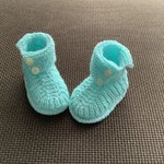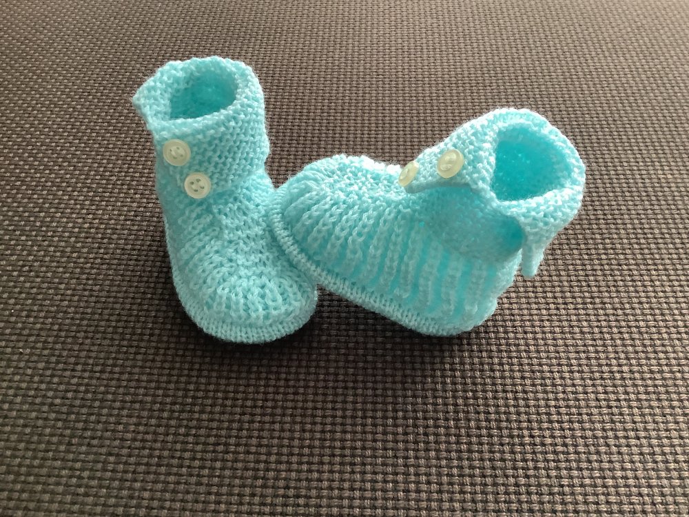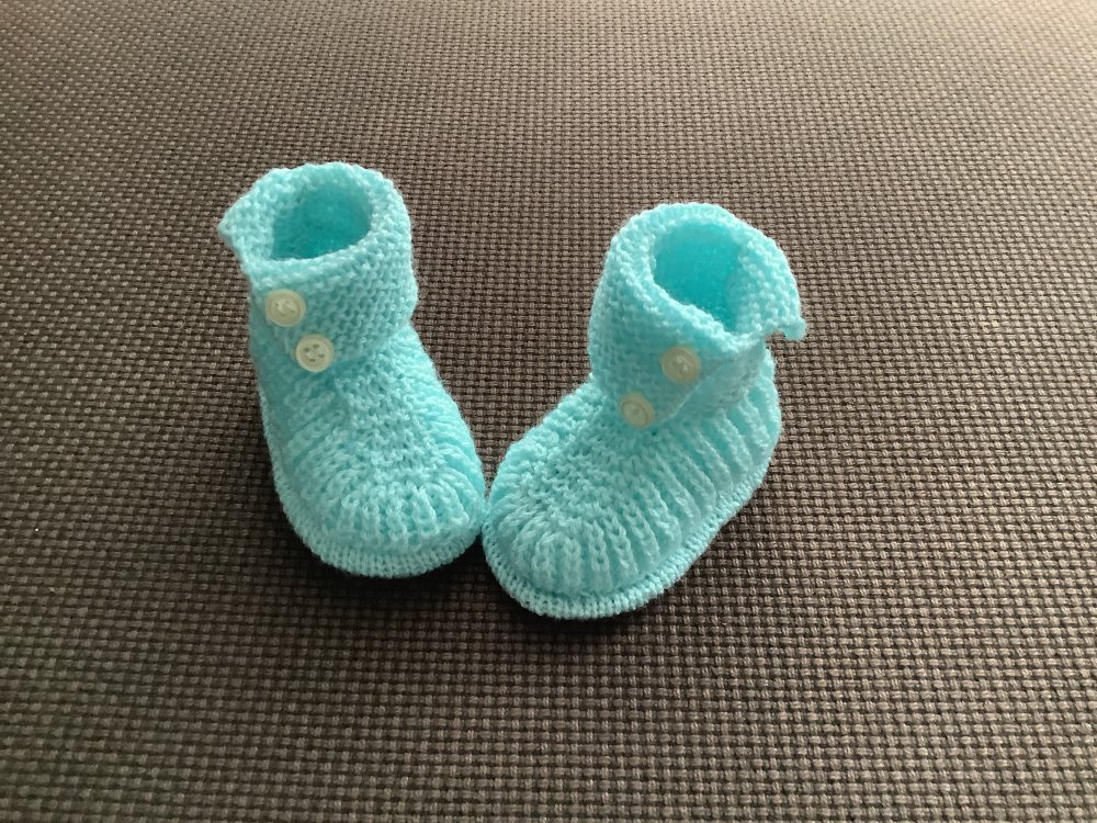 Tricoter main avec soin, ces petits chaussons pour un bébé de 1-3 mois. Fille ou garçon.
