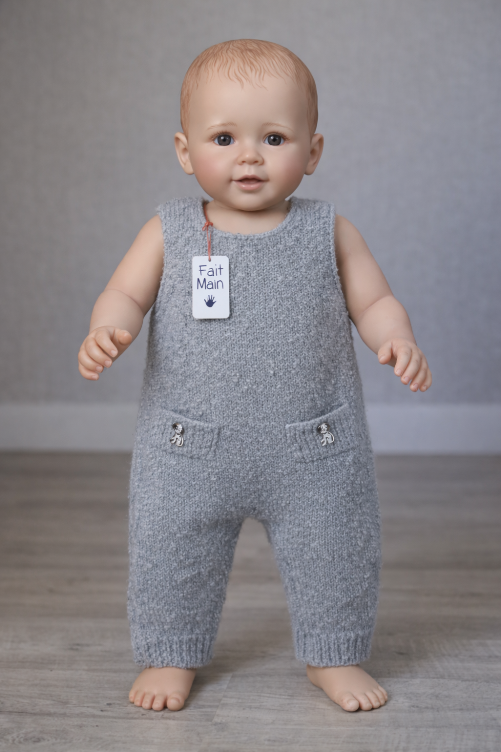 s'enfile très facilement vu son élasticité, et ce ferme par une patte boutonnée sur chaque épaule. Les boutons que j'y ai cousu représente des dalmatiens ainsi que sur les poches de devant.