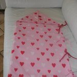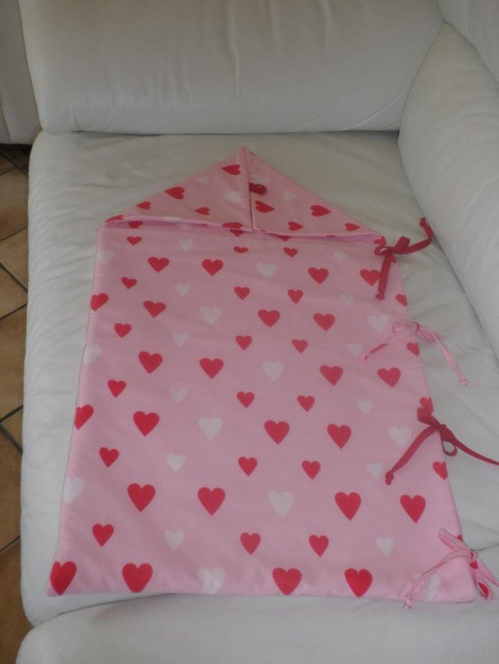 Nid d'ange avec capuche en tissu coton couleur rose avec motifs petits cœurs rouges et blancs.
