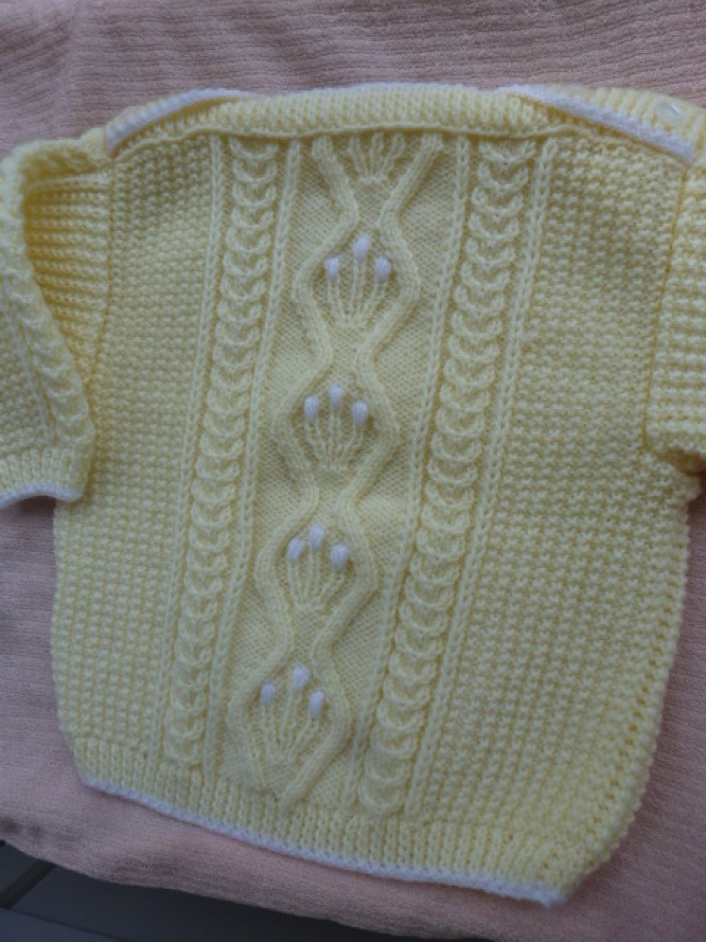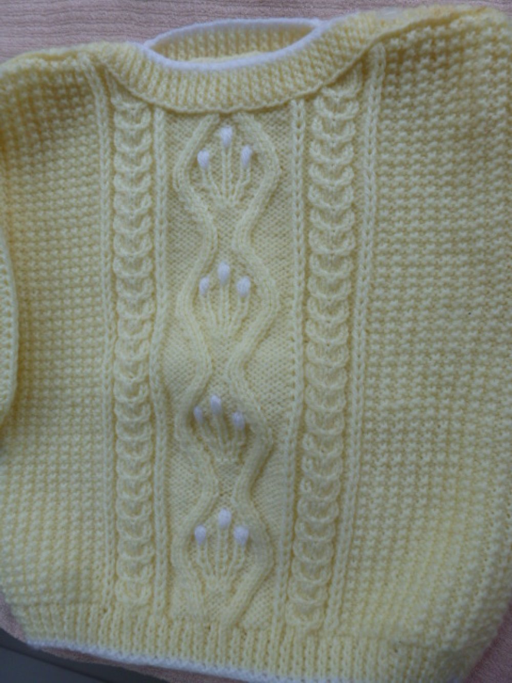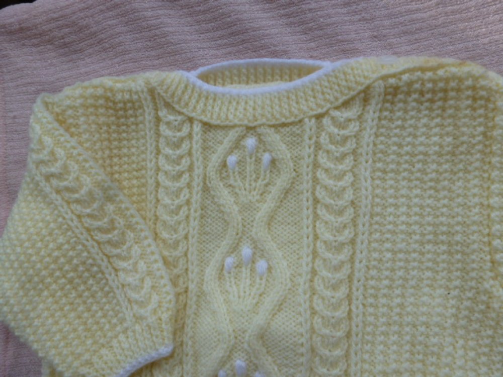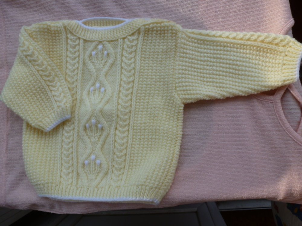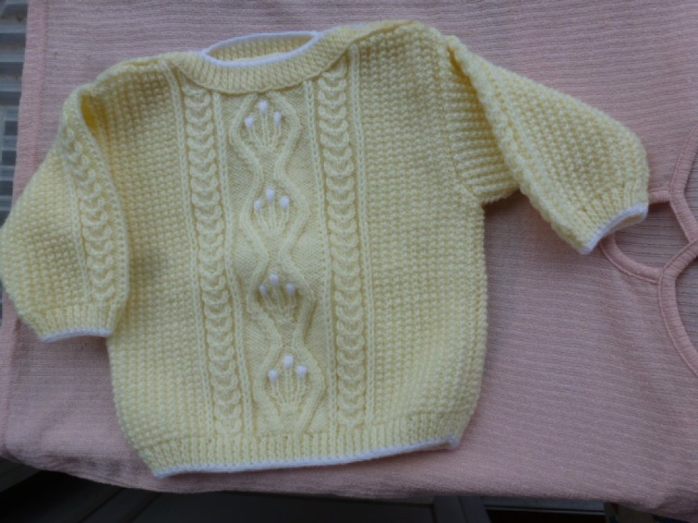Pull bébé 6/12 mois jaune pastel très clair bordé de blanc, fait main