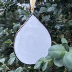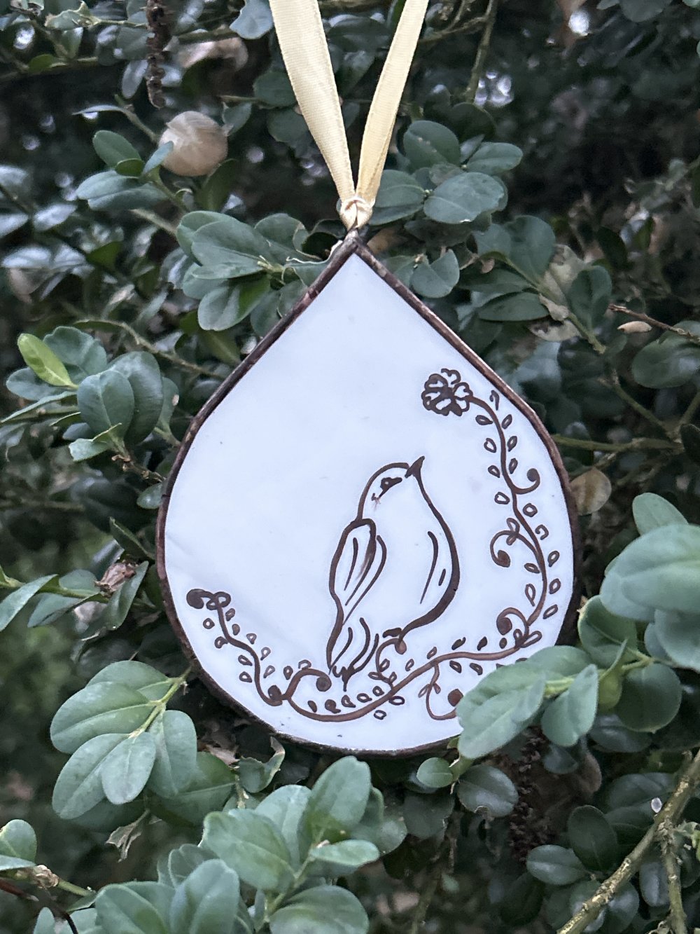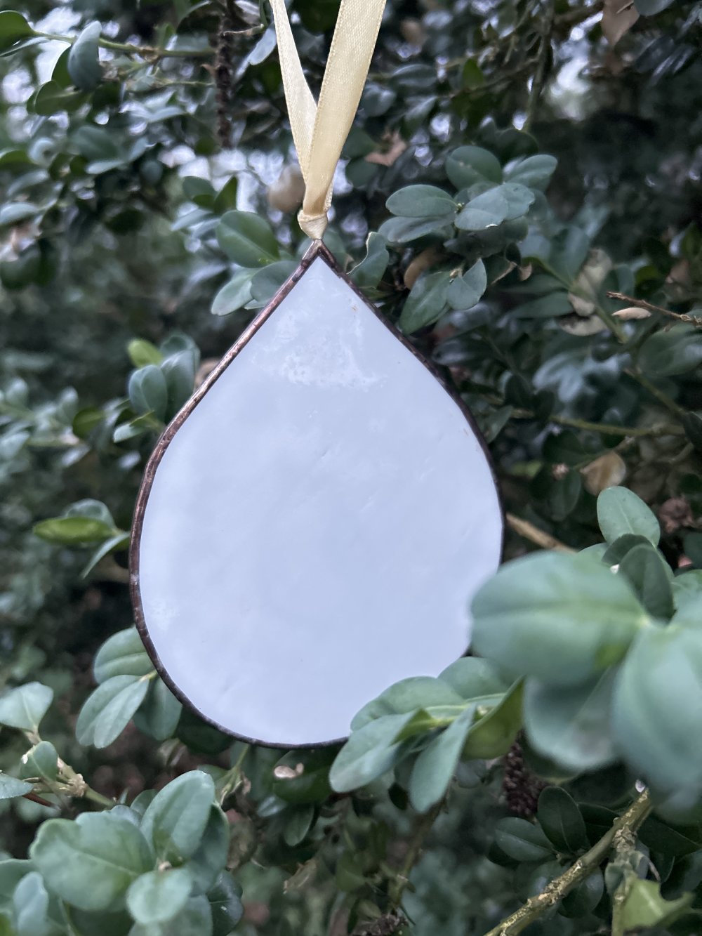 Cette suspension en verre est peinte sur un verre blanc opaque, puis sertie d'un ruban de cuivre et étamée.