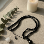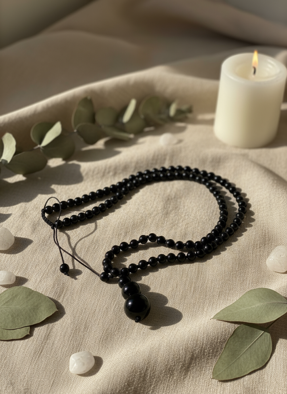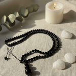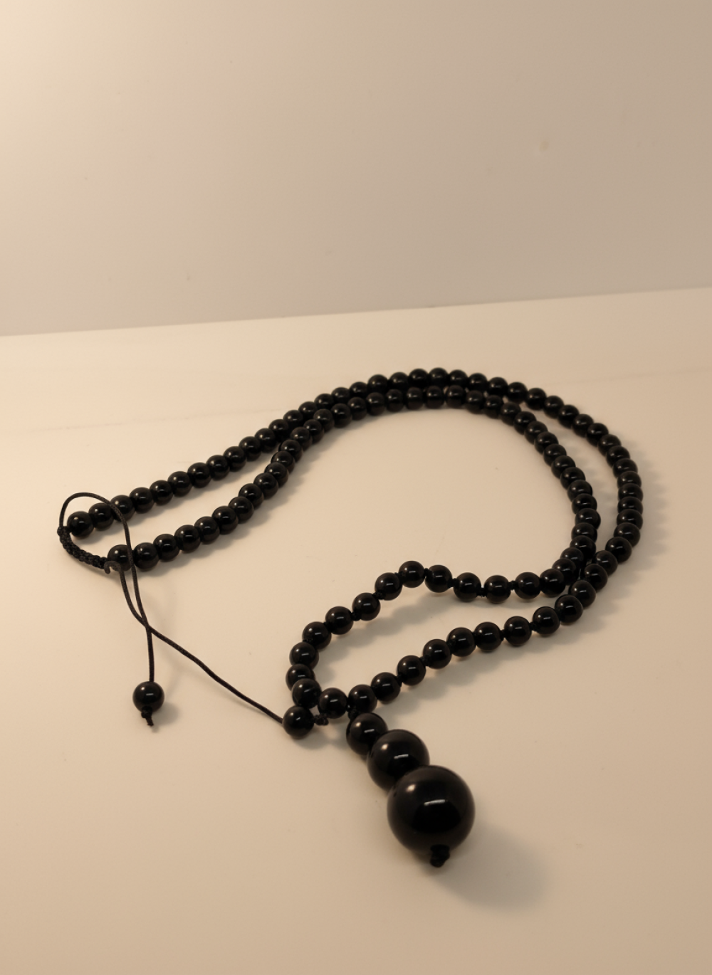 Collier artisanal composé de perles noires brillantes, noué à la main dans un style minimaliste. Un bijou élégant et unisexe, parfait pour un look moderne ou comme idée cadeau unique.