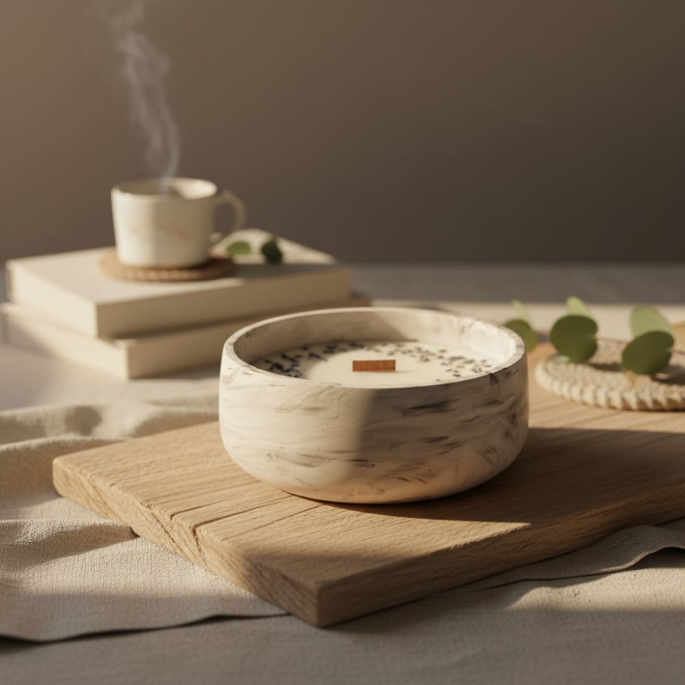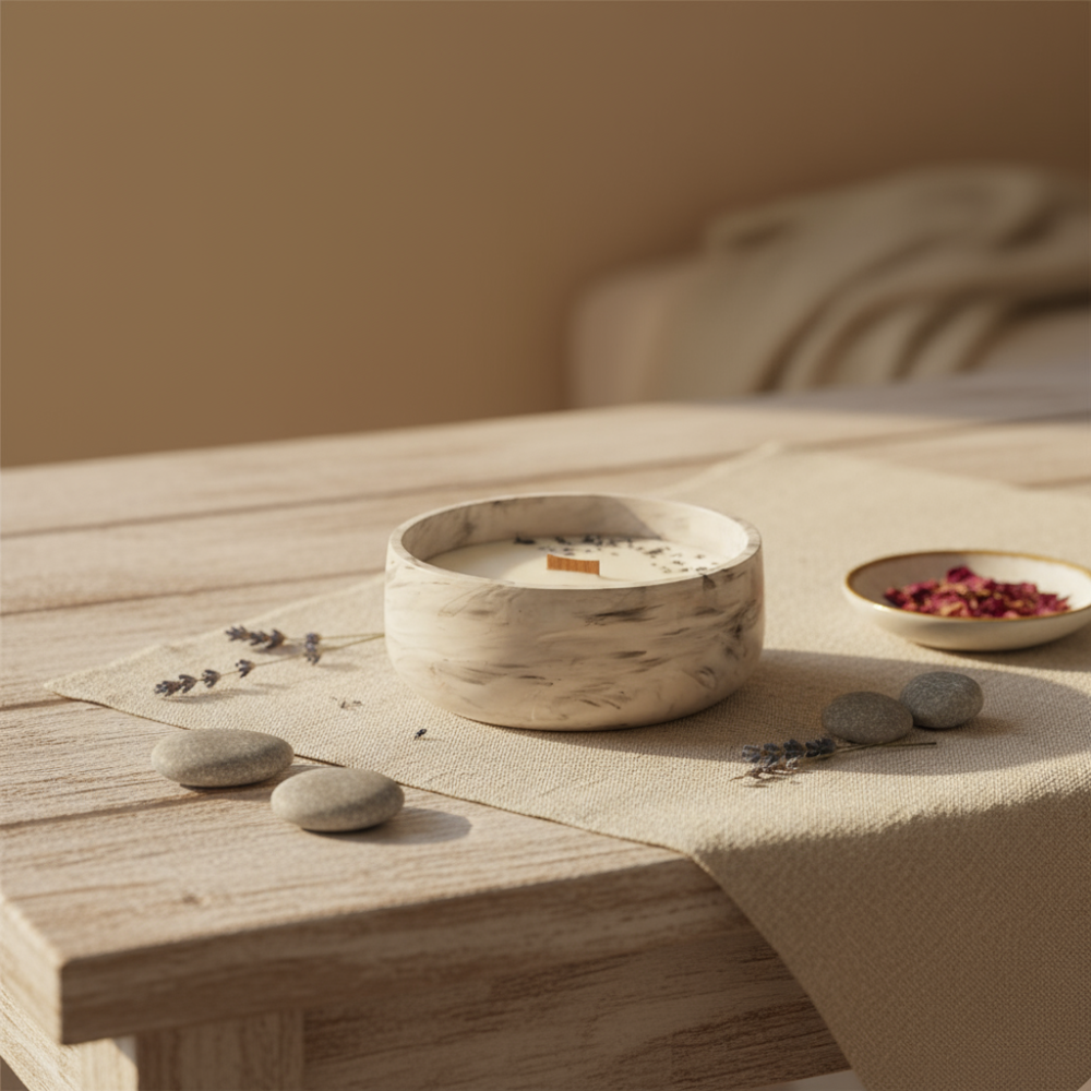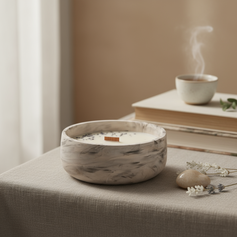 Découvrez une pièce élégante et apaisante signée Atelier LikaNova : une bougie artisanale marbrée, coulée à la main en cire de soja naturelle et dotée d’une mèche en bois crépitante.