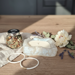 Coffret bien-être artisan – bougie époxy, tisane parfumée & bracelets bouddhistes – cadeau zen & relaxation