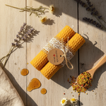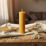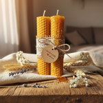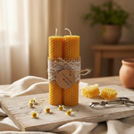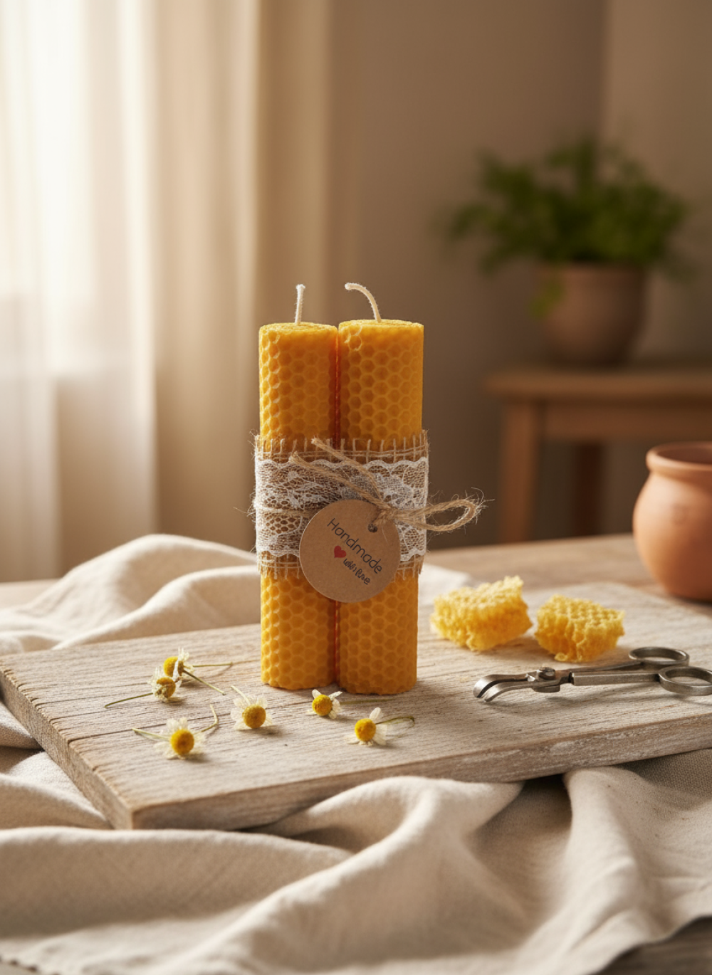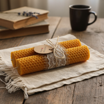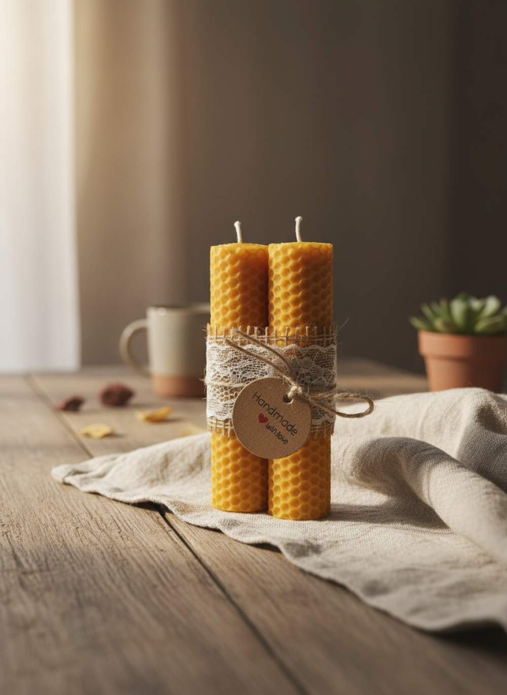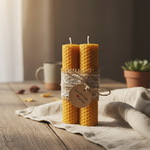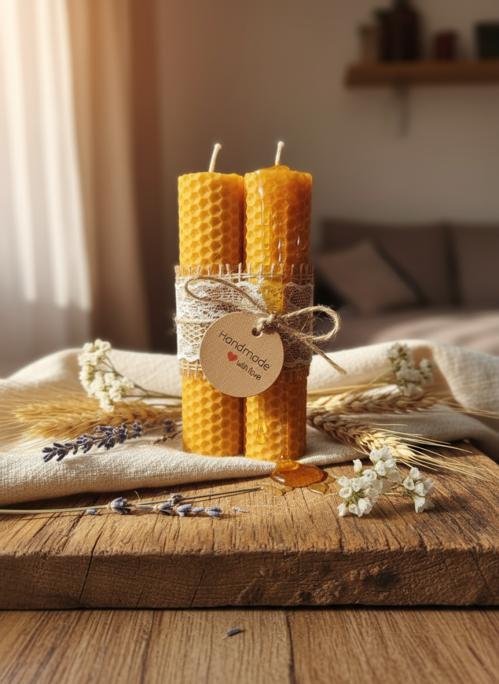 Lot de 2 bougies artisanales en cire d’abeille roulée, 100% naturelles et faites à la main. Un duo chaleureux, au parfum miel subtil, parfait pour une décoration rustique, zen ou comme idée cadeau.