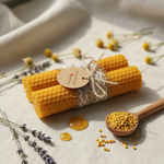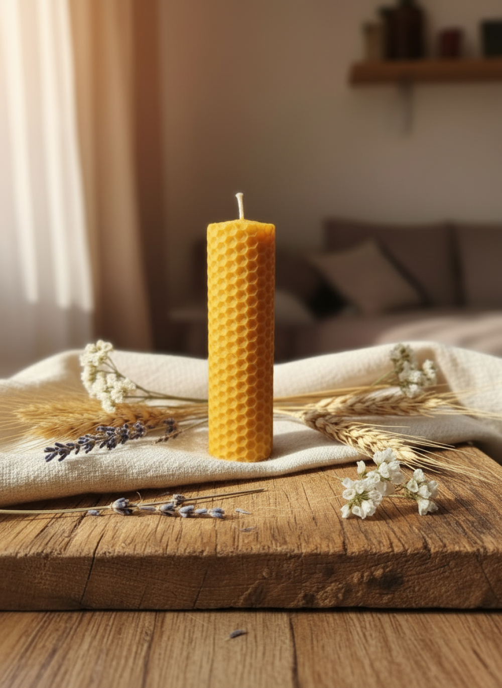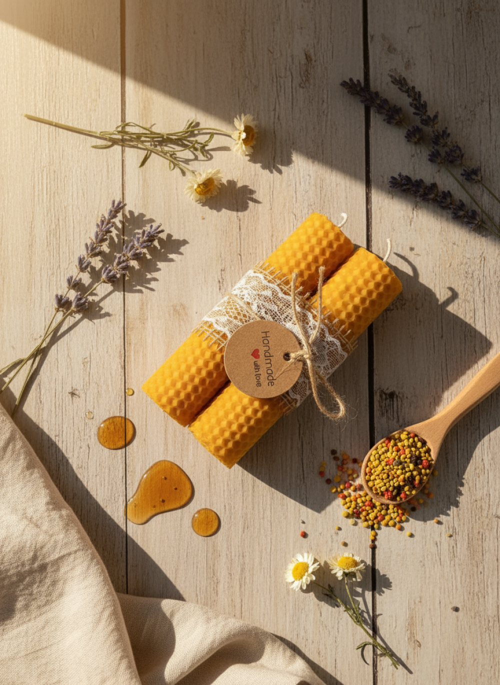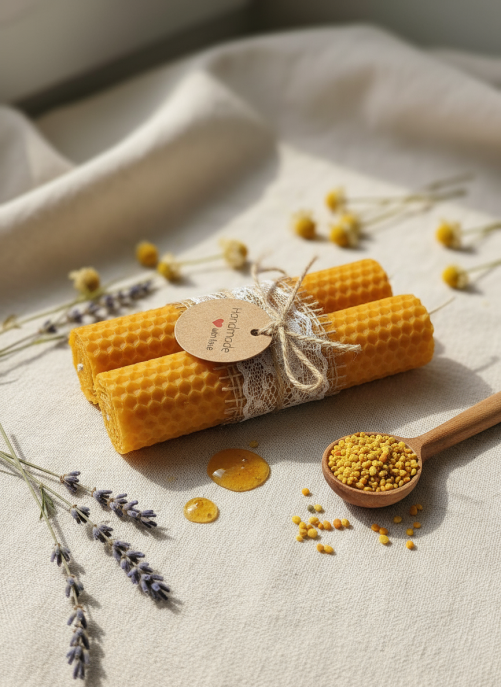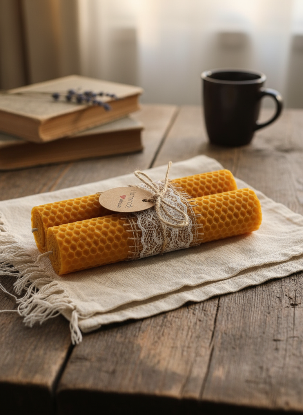 Chaque bougie est roulée à la main à partir de cire d’abeille en feuille, puis délicatement nouée avec un ruban naturel et une étiquette artisanale.