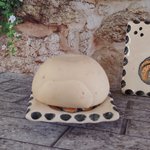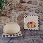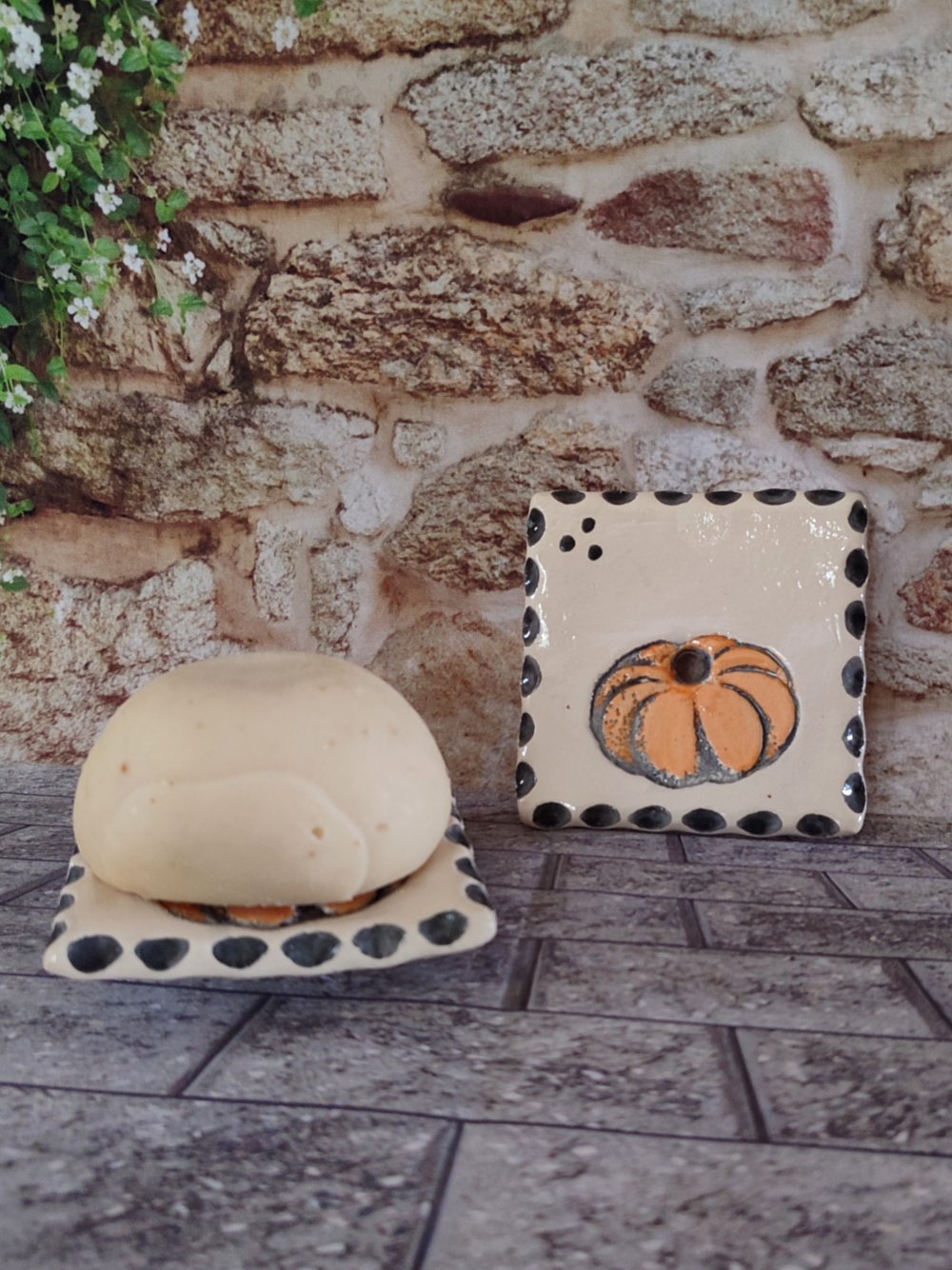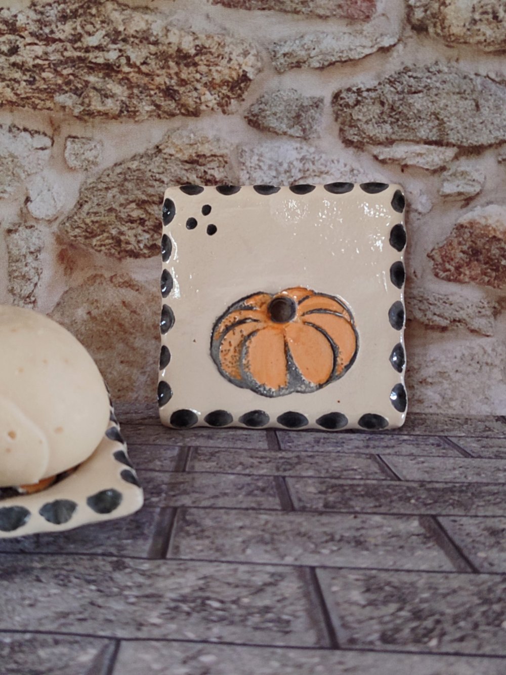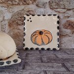 Porte- savon décoratif carré en grès émaillé modelé et décoré à la main par mes soins, décor empreinte " Citrouille" . Un trou au centre permet l' évacuation de l’eau afin de garder votre savon au sec pour le conserver plus longtemps, l’ensemble est monté sur un petit pied.