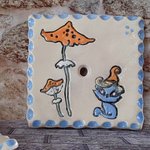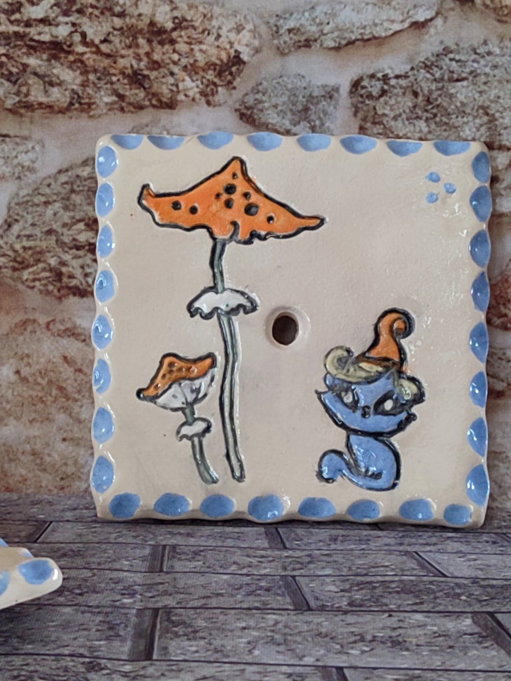 Apportez une touche de magie et de poésie à votre salle de bain avec ce porte-savon carré en céramique entièrement fait main. Peint avec soin, il met en scène un adorable petit chat-sorcière bleu coiffé d’un chapeau pointu, assis près de deux champignons féeriques orange.