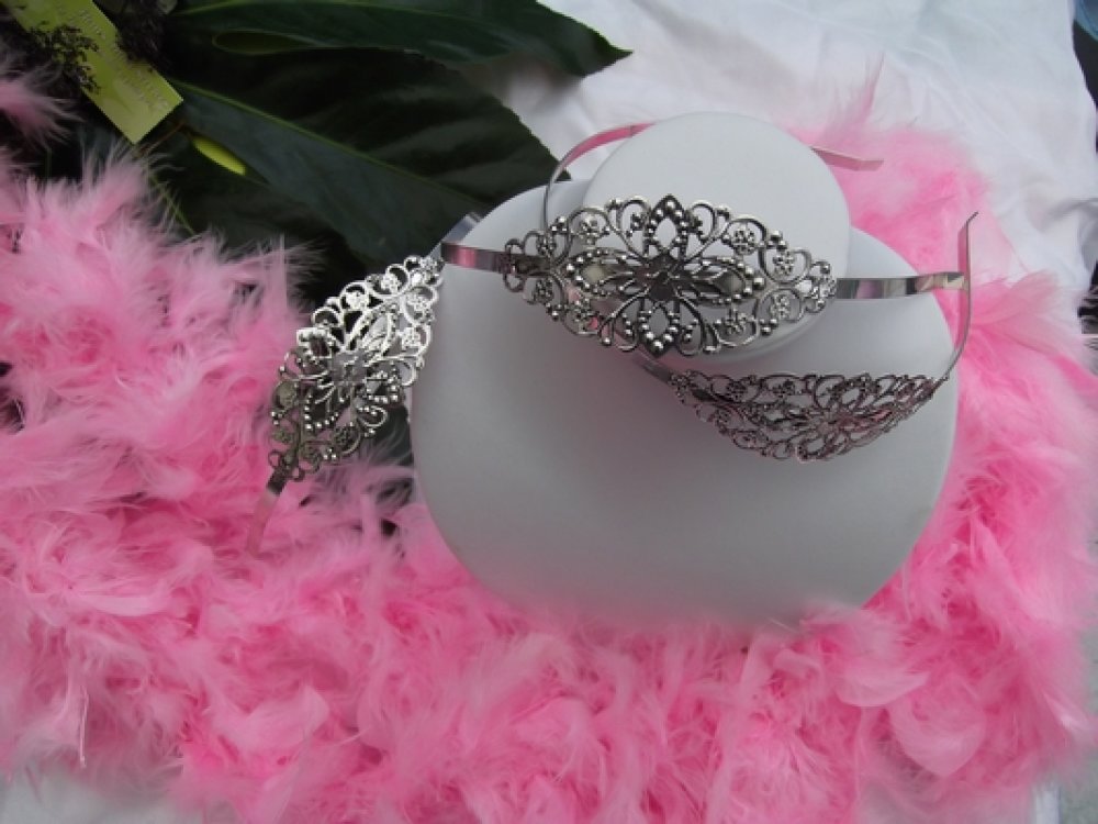1 Serre tête fleur 38cm filigrane argenté gris brillant à customiser arc de cercle