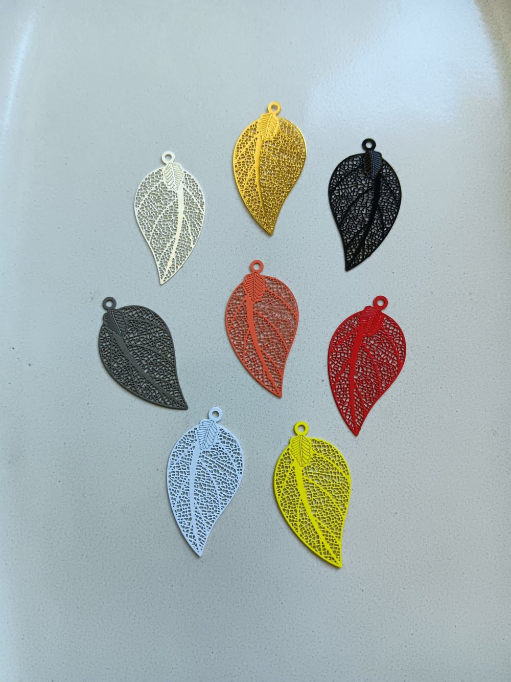 Estampe filigrane feuille jaune en métal. Dimensions : 38x19mm - A l'unité ou en lot de 10 pièces