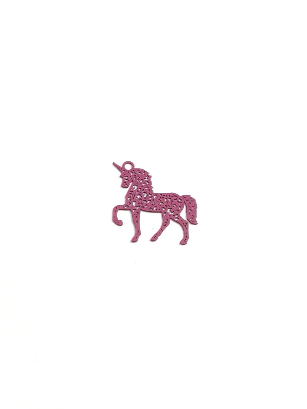 Estampe filigrane licorne mauve, en métal. Dimensions : 21x23mm.
