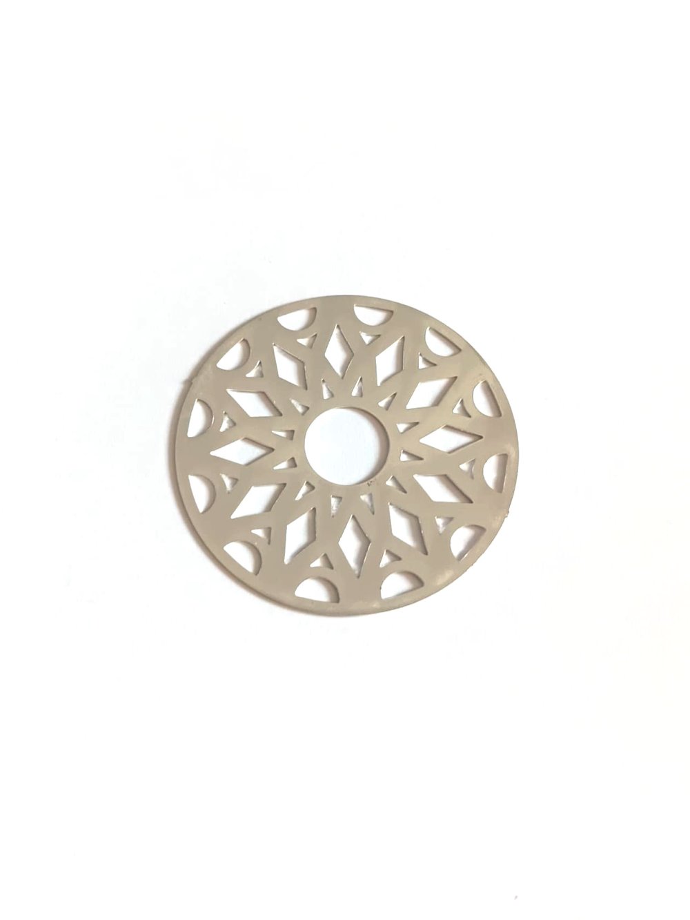 Estampe filigrane rond, motif géométrique, en métal argenté. Dimensions : 33mm - A l'unité ou en lot de 10 pièces