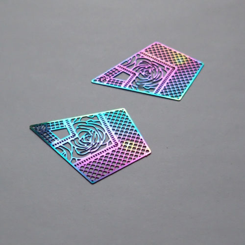 Une breloque estampe en métal multicolore d'un côté bleu-vert, de l'autre violet fuchsia jaune.