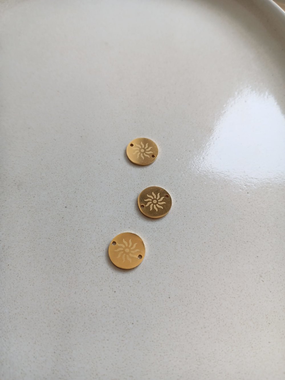 Sequin intercalaire soleil doré en acier inoxydable. Dimensions : 12mm, trou 1,2mm.
