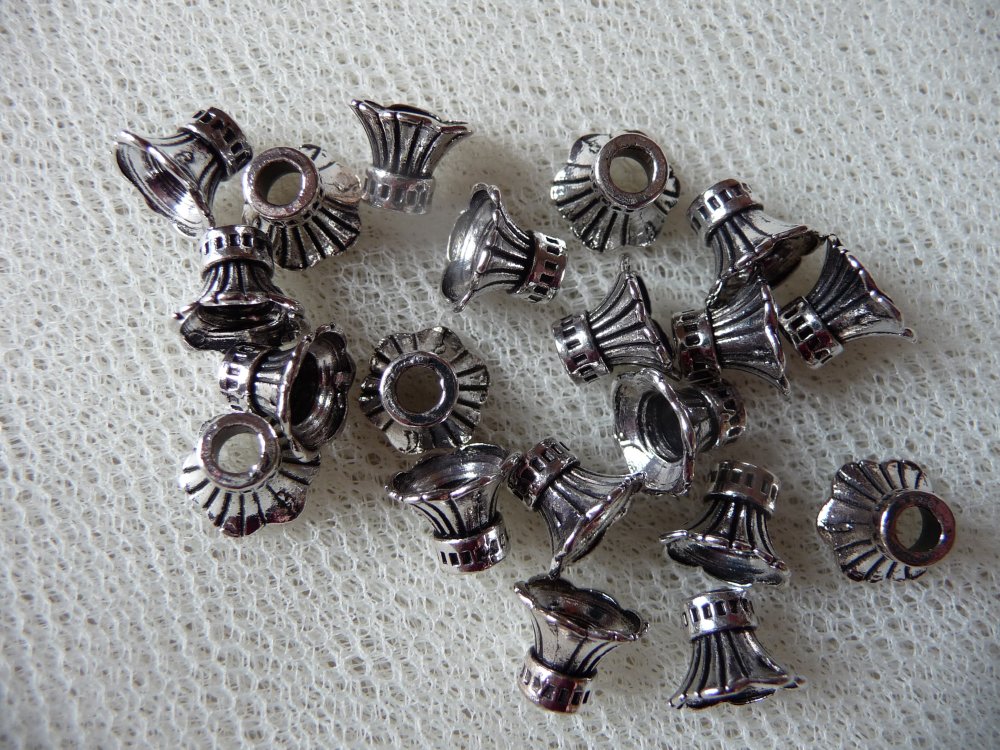 Je vous propose cet ensemble de 20 coupelles/calottes forme tulipe avec stries, en métal argenté vieilli.