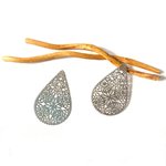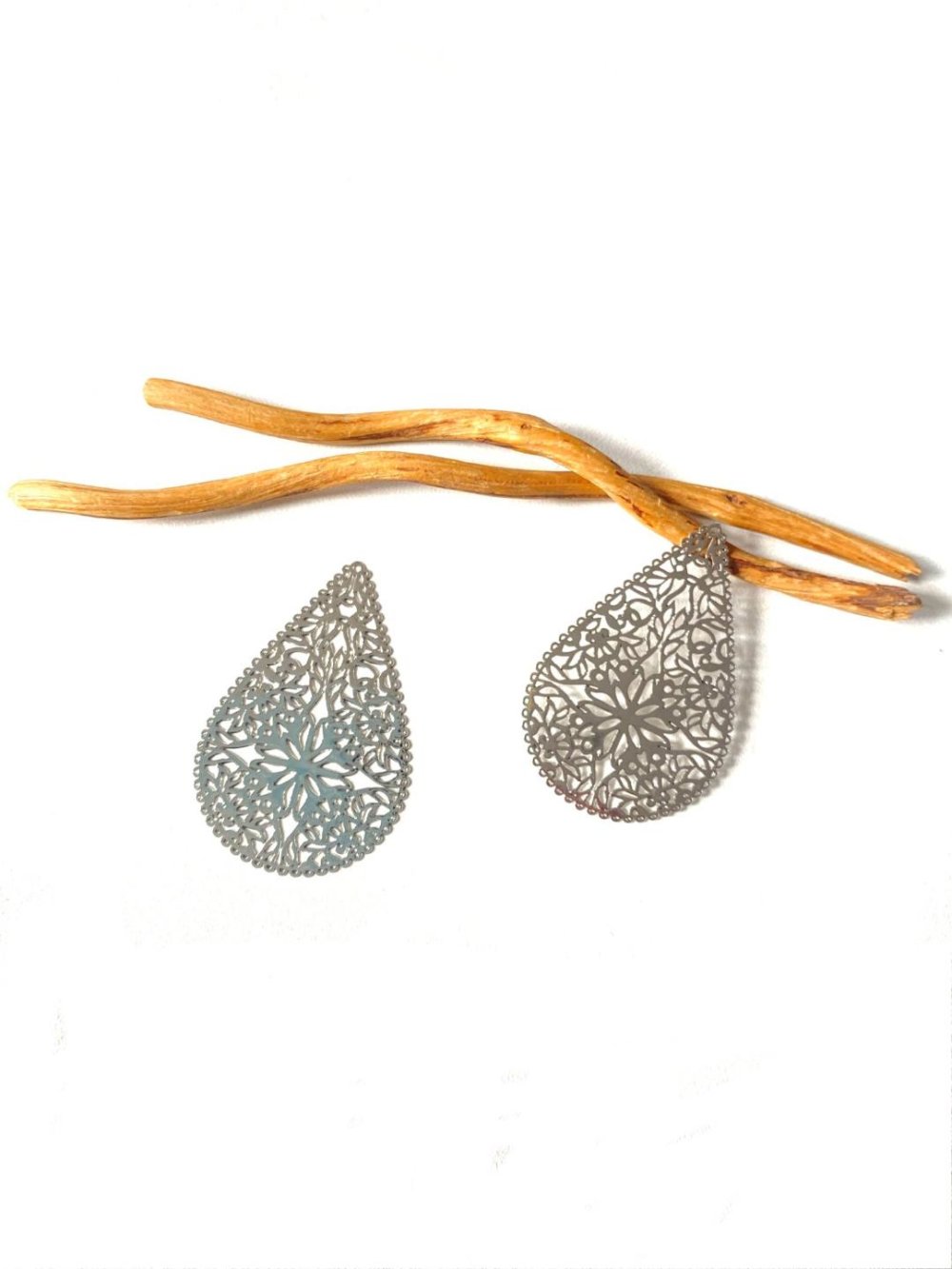 X 2Pendentifs Estampe gouttes grise Filigrane 40x27 mm.