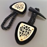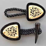 Brandebourg de très bonne qualité. Les extrémités sont composées d'une base en simili cuir recouverte d'une fine épaisseur de fourrure synthétique très douce. Par dessus cette fourrure, une plaque formée d'arabesques ajourés de coloris doré est fixée grâce à des rivets et donne tout son caractère élégant au brandebourg.