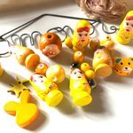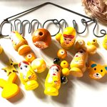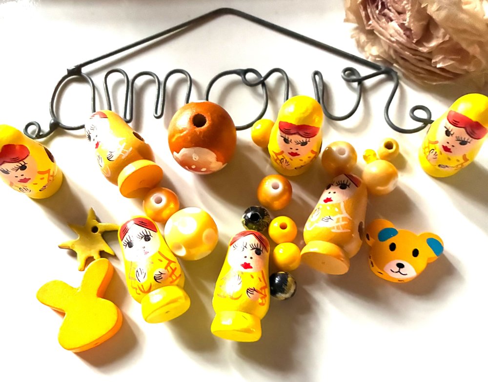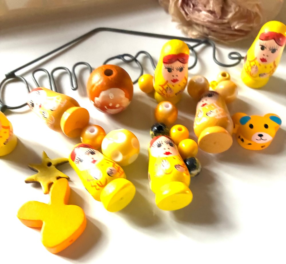 Ce lot est composé de perles en bois : poupées en bois dans les tons de jaune et orange, têtes de lapin, ourson, et perles rondes.