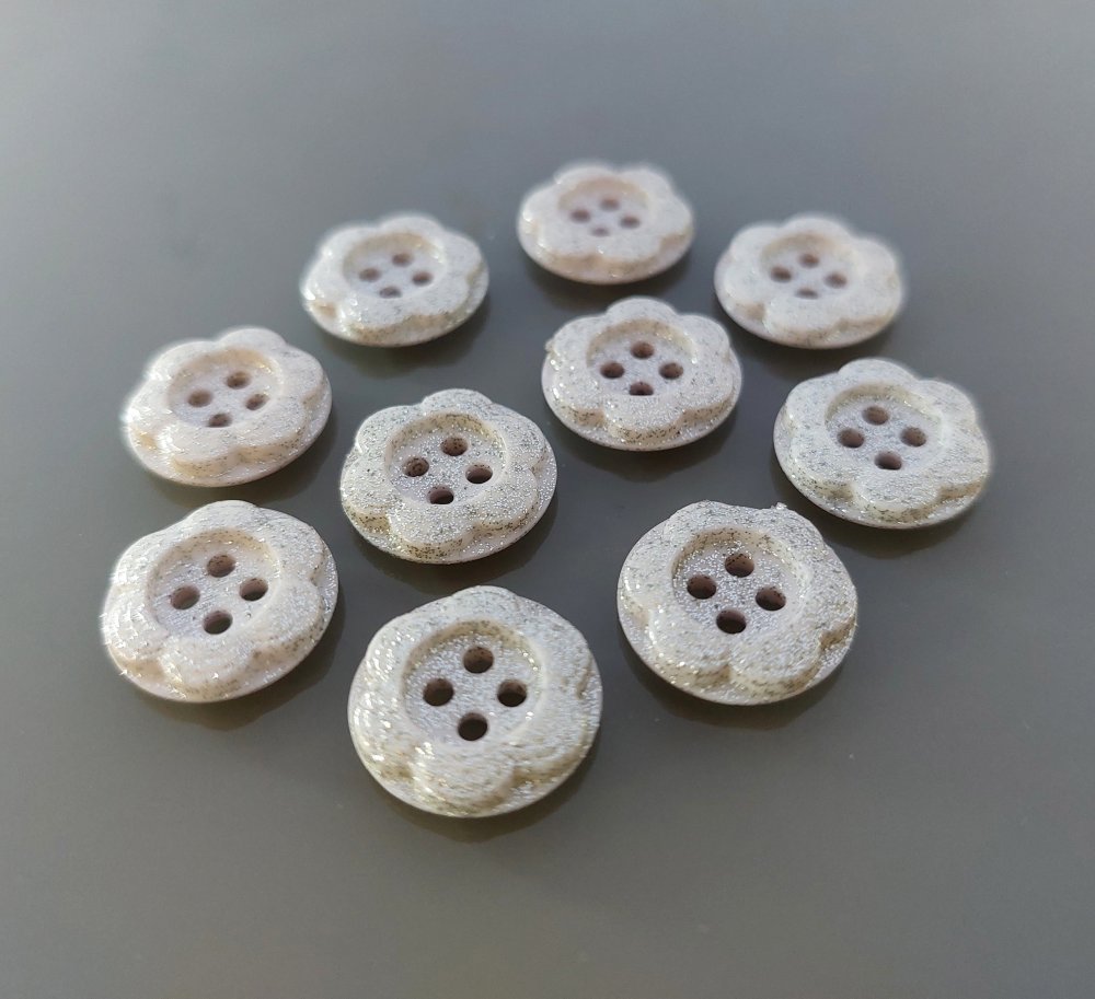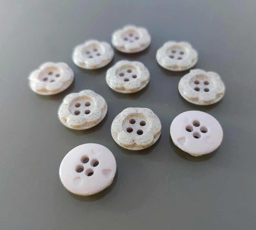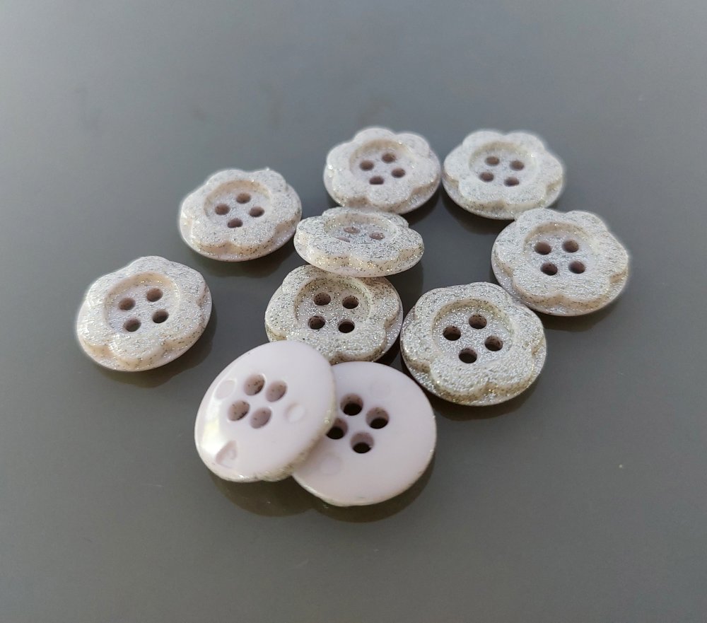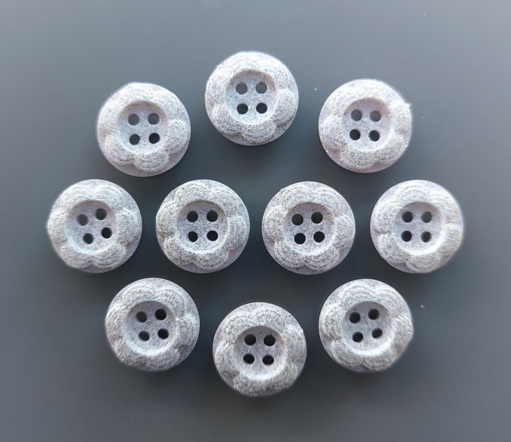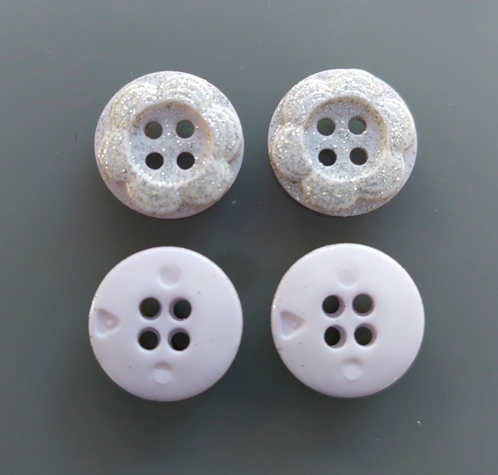 10 boutons fleurs 15 mm plastique mauve pâle et paillettes argentées