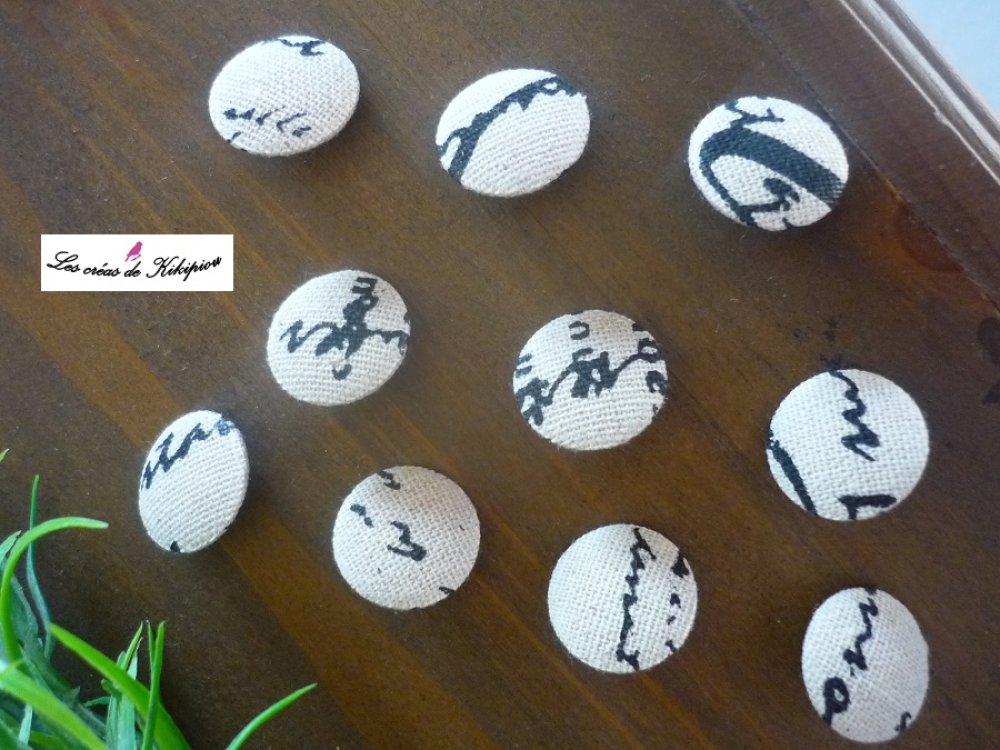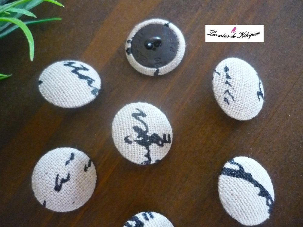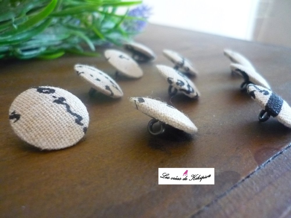 Lot de 10 boutons recouverts de tissu lin à impression fantaisie noire.